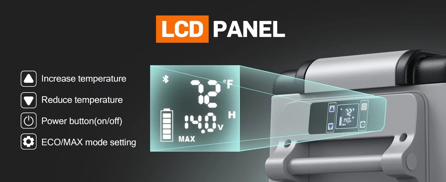 - LCD PANEL&BLUETOOTH CONNECTION - The LCD panel allows you to directly see the operation of the 12v refrigerator for car and adjust the temperature range at any time. You can set any temperature between-4℉-68℉(-20℃-20℃) on the panel. Car cooler also has a Bluetooth mode, with a mobile app, so you can remotely control portable car fridge without being around the machine.