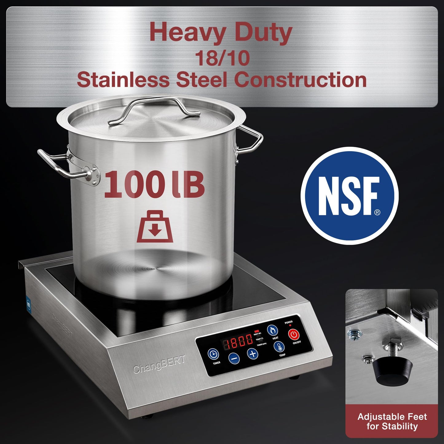 ChangBERT Portable Induction Cooktop 1800W NSF Certified Commercial Range Powerful Countertop Burner Pro Chef Professional Hot Plate 18/10 Stainless Steel Housing Schott Glass 10 Hours Timer