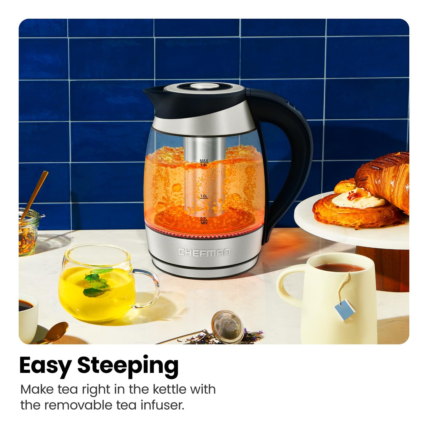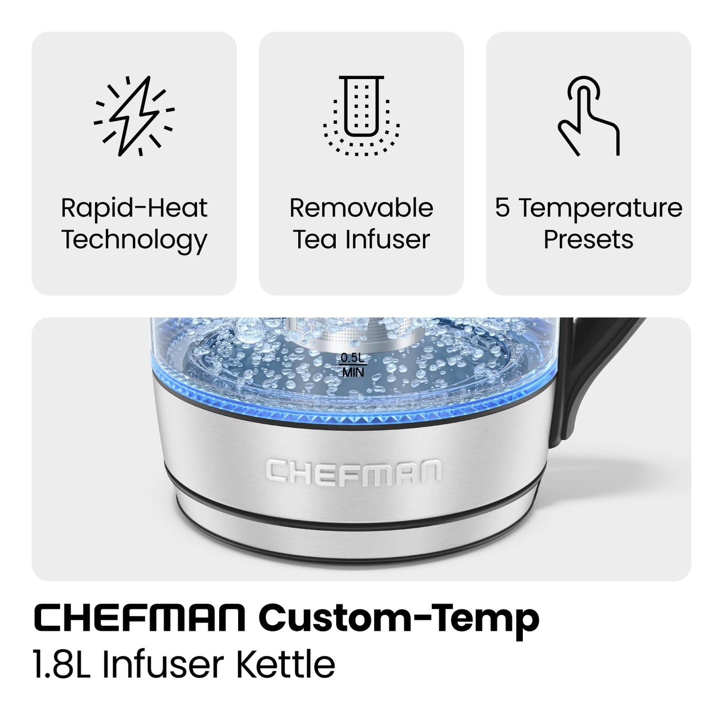 Chefman Electric Kettle with Temperature Control, 5 Presets LED Indicator Lights, Removable Tea Infuser, Glass Tea Kettle & Hot Water Boiler, 360° Swivel Base, BPA Free, Stainless Steel, 1.8 Liters