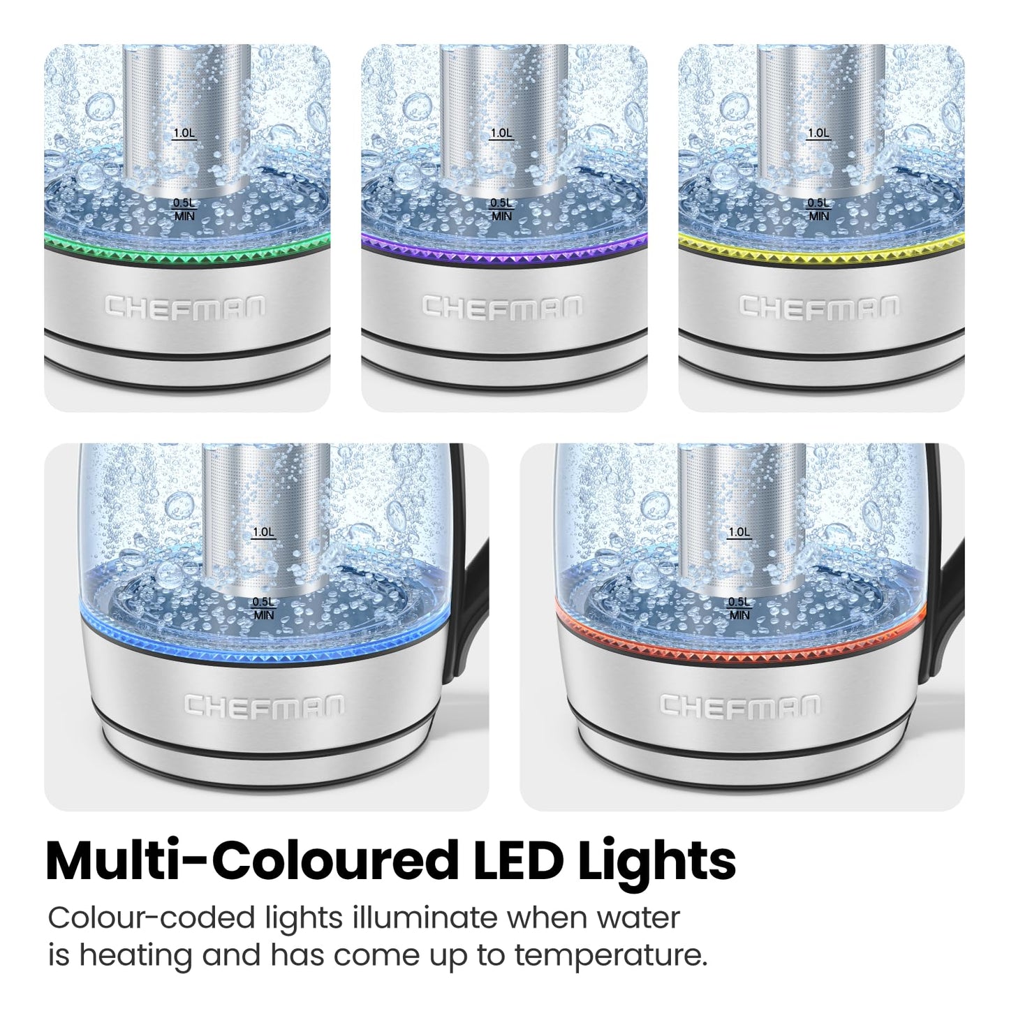 - TRI-COLOR LED LIGHTS: Easily see when your glass teapot with infuser is in standby mode (white lights), heating mode (red lights), and in keep warm/steep mode (green lights).