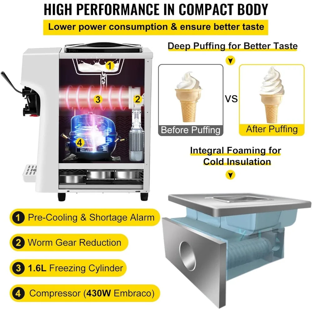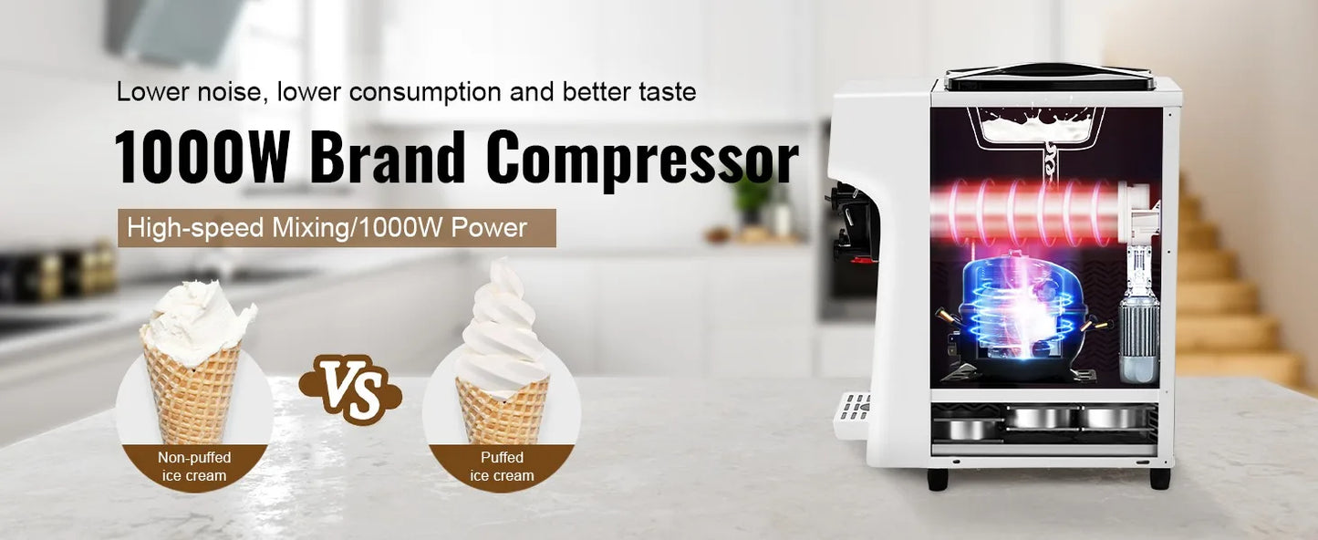 - Comprehensive Performance: The 1000W power (total) provides continuous and lasting power for our soft ice cream machine. The 430W Embraco compressor is efficient in ice cream making, and the worm gear system ensures lower noise, and longer service life. The pre-cooling function is equipped and the hopper and cylinder are wrapped in an integral insulation layer, keeping the ingredients fresh for longer. The puffing tube makes your ice cream look more attractive and taste delicious.