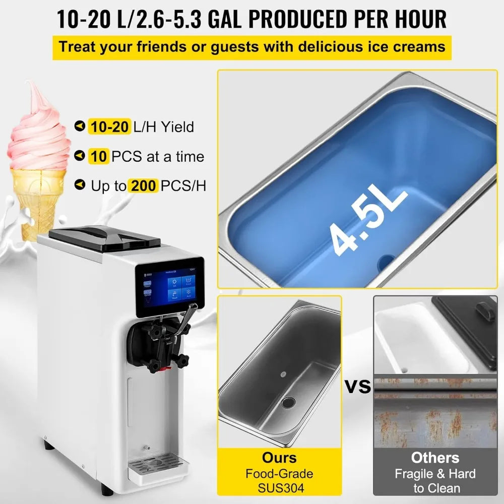 Commercial Ice Cream Maker, Countertop Soft Serve Machine with 4.5L Hopper 1.6L Cylinder Touch Screen Puffing Shortage Alarm