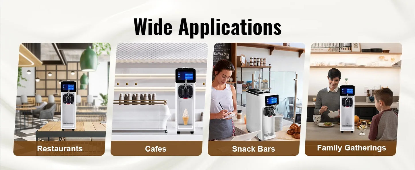 This commercial soft serve ice cream machine can provide your friends or customers with sufficient soft ice cream, custard, yogurt, gelato, and sorbet in a short period. It is widely applied in snack bars, cafés, drink shops, restaurants, bakeries, buffets, fast food chains, and so on.