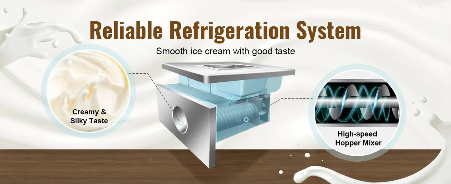 The thickened integral cold insulation layer surrounds the mixing hopper and freezing cylinder; a reliable cold insulation effect can be achieved, and the raw materials can be kept fresh for longer. Driven by the powerful motor, the hopper agitator with high rotating speed produces silky mixtures.