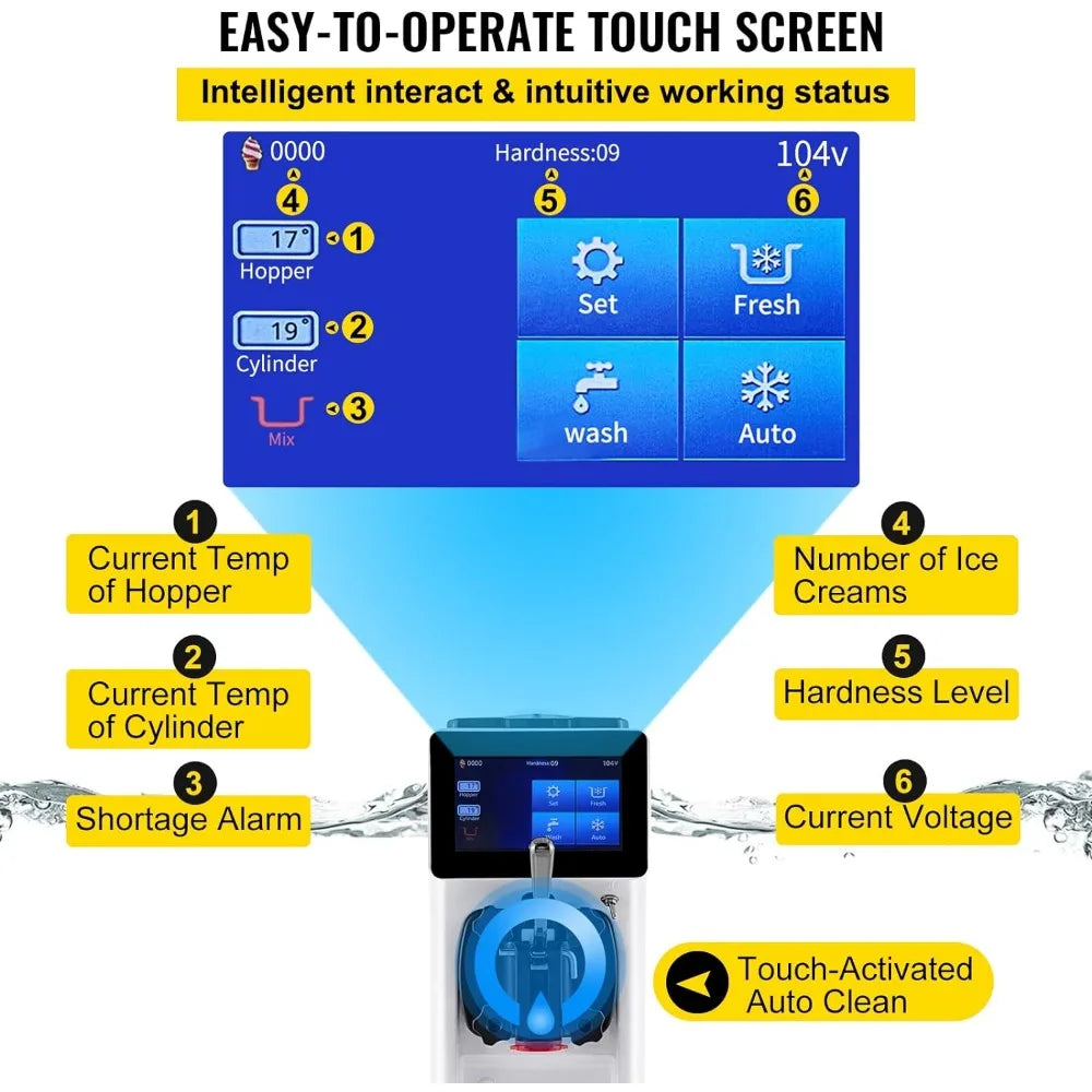 - Smart Touch Panel Control: Our soft serve ice cream maker features an extra-large touch screen. The screen shows the current temp of the hopper & cylinder, allowing you to make prompt adjustments when needed. Quantity, hardness level, and voltage are also directly displayed. The shortage alarm function will remind you to add more ingredients to the mixing hopper. Plus, self-cleaning can be activated just with one click.