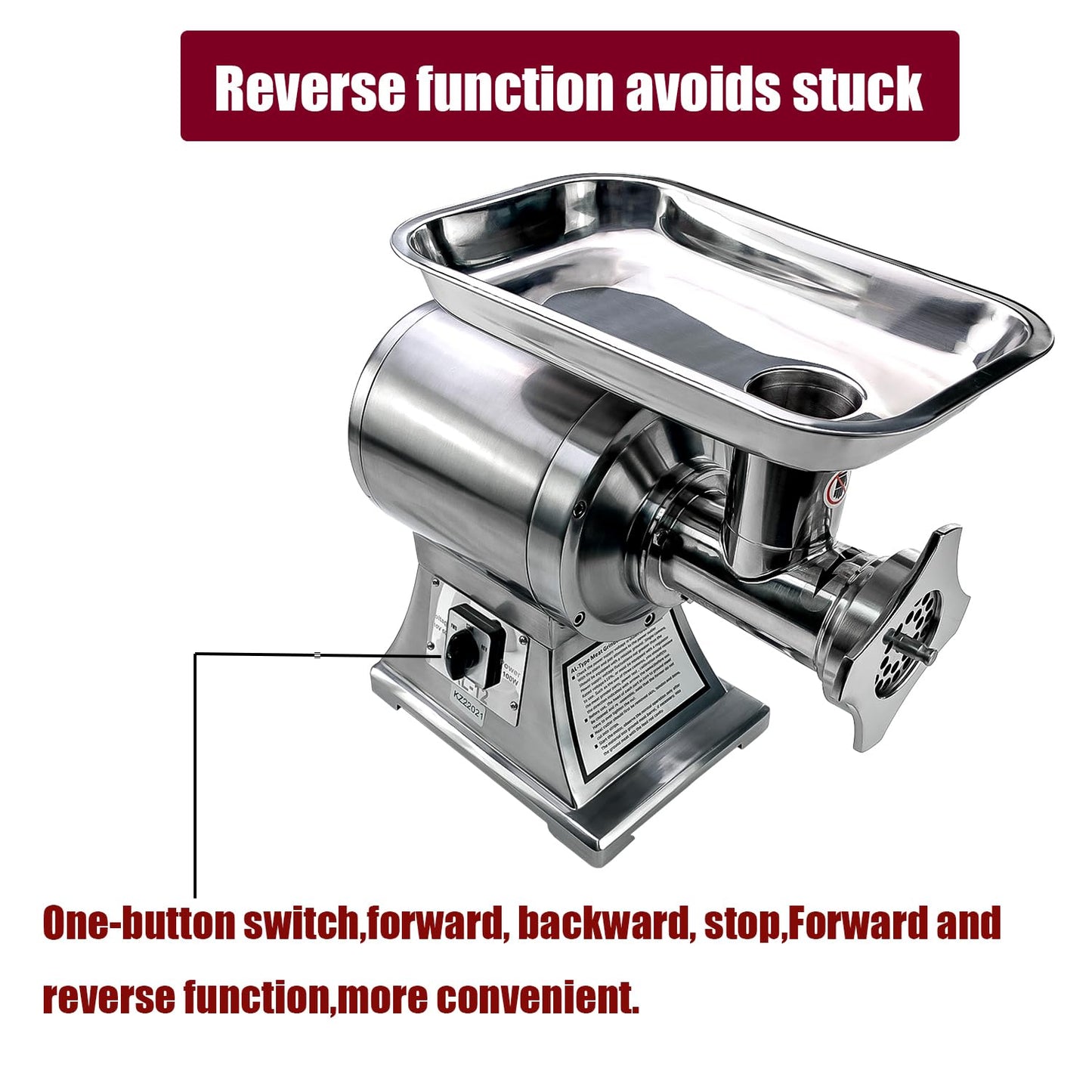 - Simple & Fast Operation: The meat mincer has 3 adjustable buttons: ON button, OFF button, REVERSE button, which is easy and convenient to operate. The REVERSE button is used to reverse the meat grinder when it is stuck, helping you remove any meat stuck on the moving parts