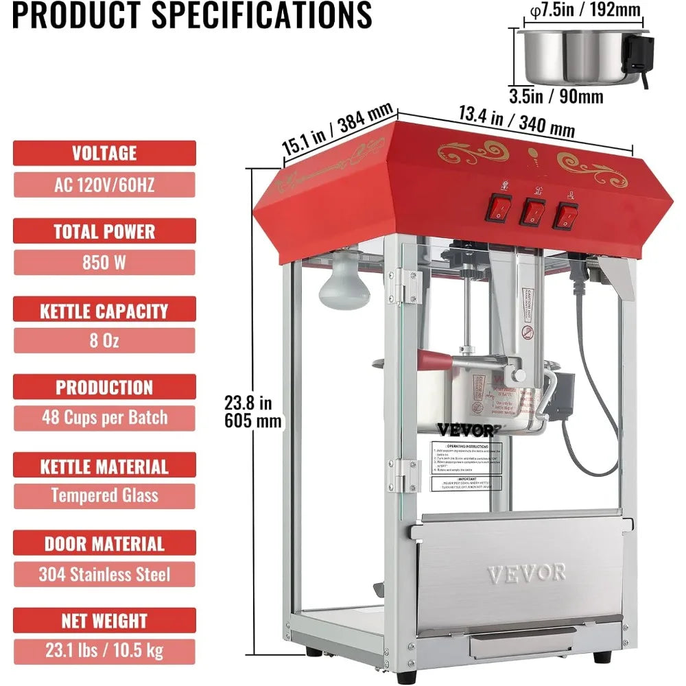 Commercial Popcorn Machine, 8 Oz Kettle, 850 W Countertop Popcorn Maker, with 3-Switch Control Steel Frame Tempered Glass Doors