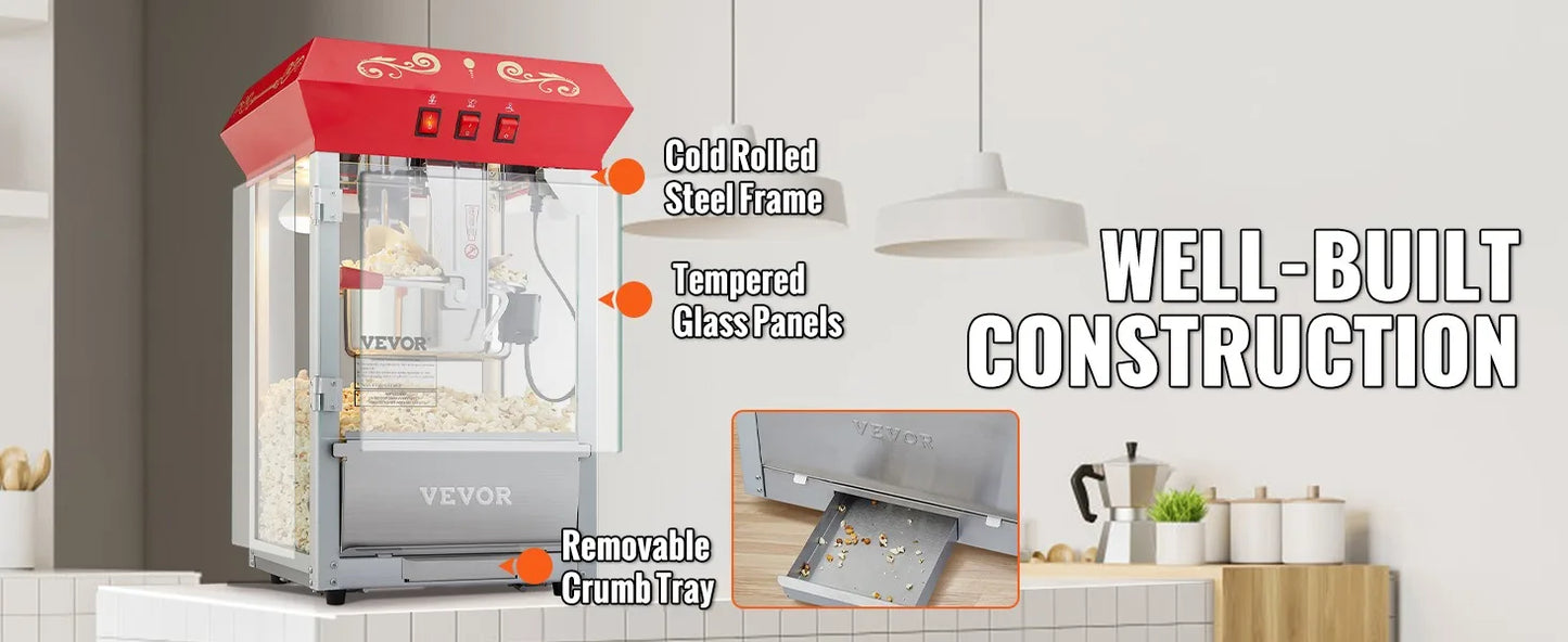 - Designed with Your Comfort in Mind: Every component of the popcorn machine feels like second nature! Once the warming deck begins to fill, simply open the hinged cover below, then the popcorn will be right there, ready to be scooped! The removable crumb tray serves to keep the chamber clean and free from stray kernels. Collecting and disposing of fallen kernels has never been easier!