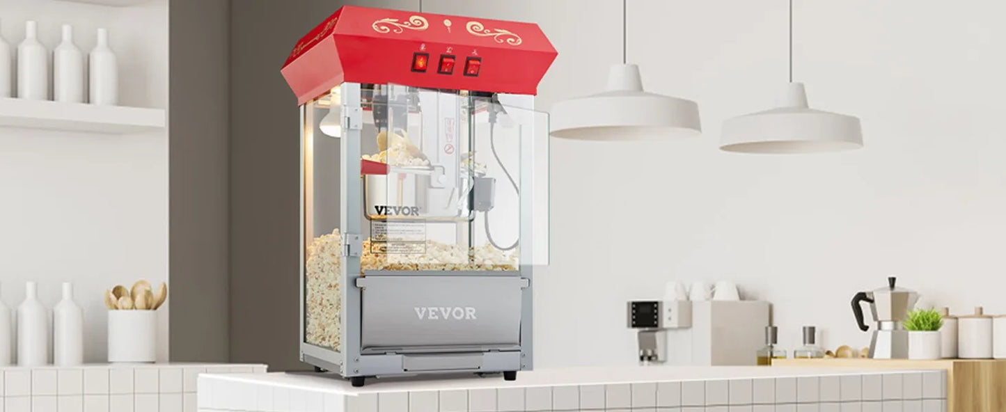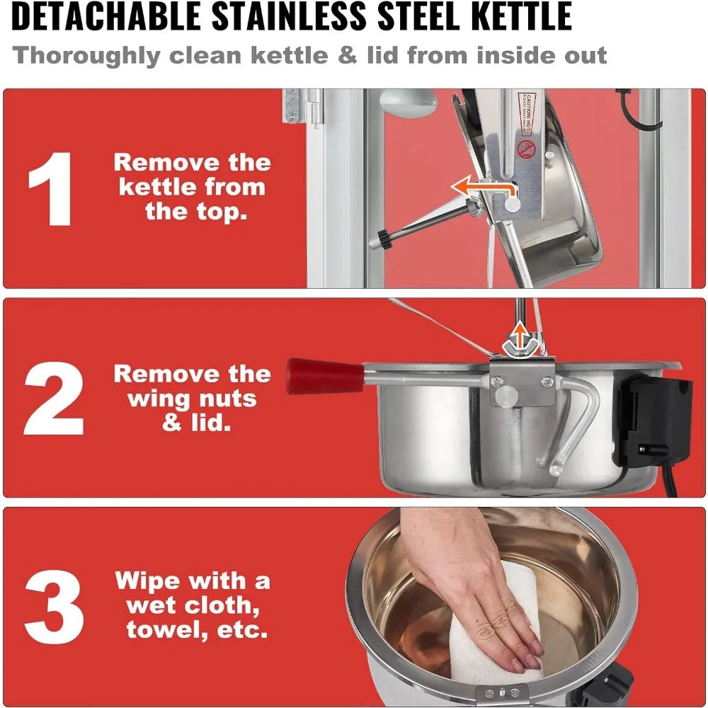 - Durable Structure, Effortless Cleaning: This countertop popcorn machine comprises a cold rolled steel frame and tempered glass panels to withstand frequent use. The doors with magnetic latch provides quick access and enhances the appearance of the popcorn inside. The printed graphics on its top may also catch some hungry stares. Besides, the wing nuts on the kettle allow you to detach its lid easily and clean its interior thoroughly. Hassle-free cleaning will extend the machine's service life.