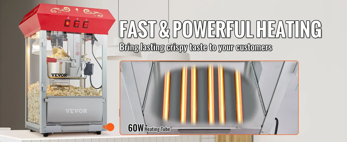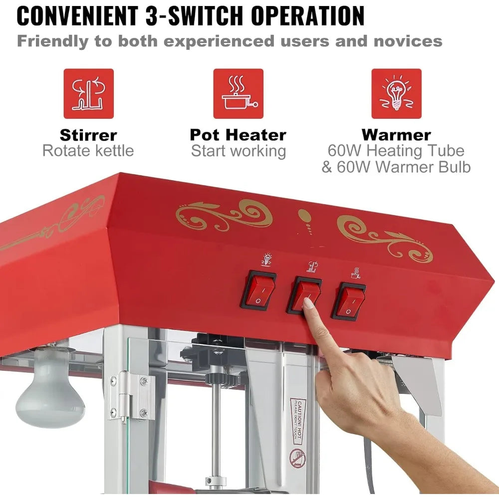 - Simple Operation, Lasting Warm: 3 fantastic switches control the whole unit: Warmer, Stirrer, and Pot Heater. Simplified control streamlines the operation, making it easy for any staff member to use. The warming deck features a 60W heating tube underneath. Once the popcorn machine begins cooking, finished popcorn will fall to the warming deck and stay fresh until you're ready to serve. Besides, the 60W warmer light brightly illuminates your popcorn. Let them shine and catch the eyes of everyone!
