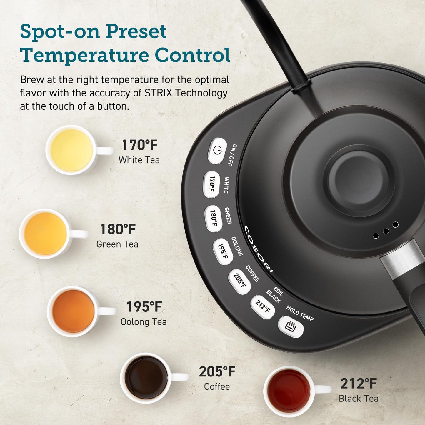COSORI Electric Gooseneck Kettle with 5 Temperature Control Presets, Pour Over Kettle for Coffee & Tea, Hot Water Boiler, 100% Stainless Steel Inner Lid & Bottom, 1200W/0.8L