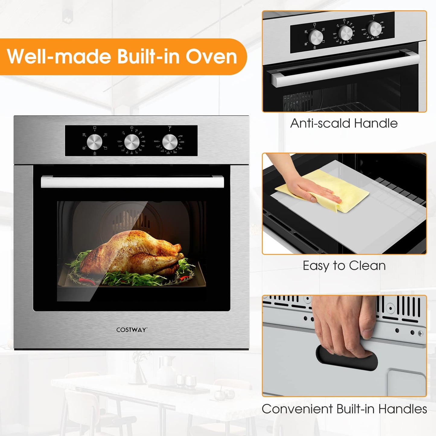 COSTWAY 24" Single Wall Oven, Electric Built-in Wall Oven with 2.47 Cu. Ft. Capacity, 5 Cooking Functions, 360° Rotisserie and Timer, 2300W Built-in Oven in Stainless Steel with Mechanical Knobs