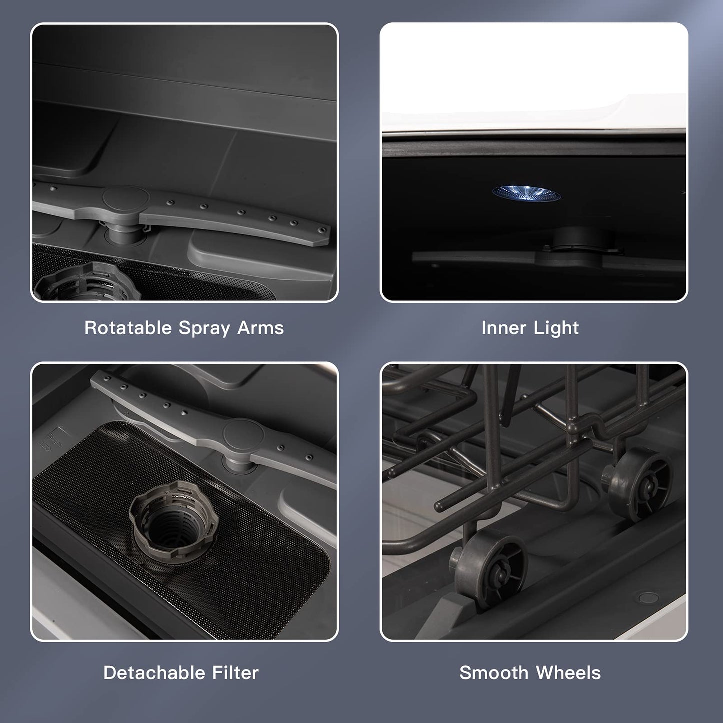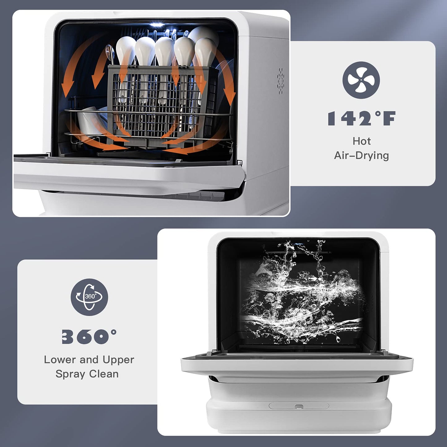 - 360° DOUBLE SPRAY ARMS FOR EFFECTIVE RINSING------Top and lower spray arms of the portable dishwasher can swivel 360 °and rinses off various degrees of the stain from all angles. The compact dishwasher has a total of 22 water ports to provide powerful water spray, convenience for cleaning pots and pans and single serve dishes. There is a designated spot for you to place a cleaning tablet or you can just throw the dishwasher powder into the machine.