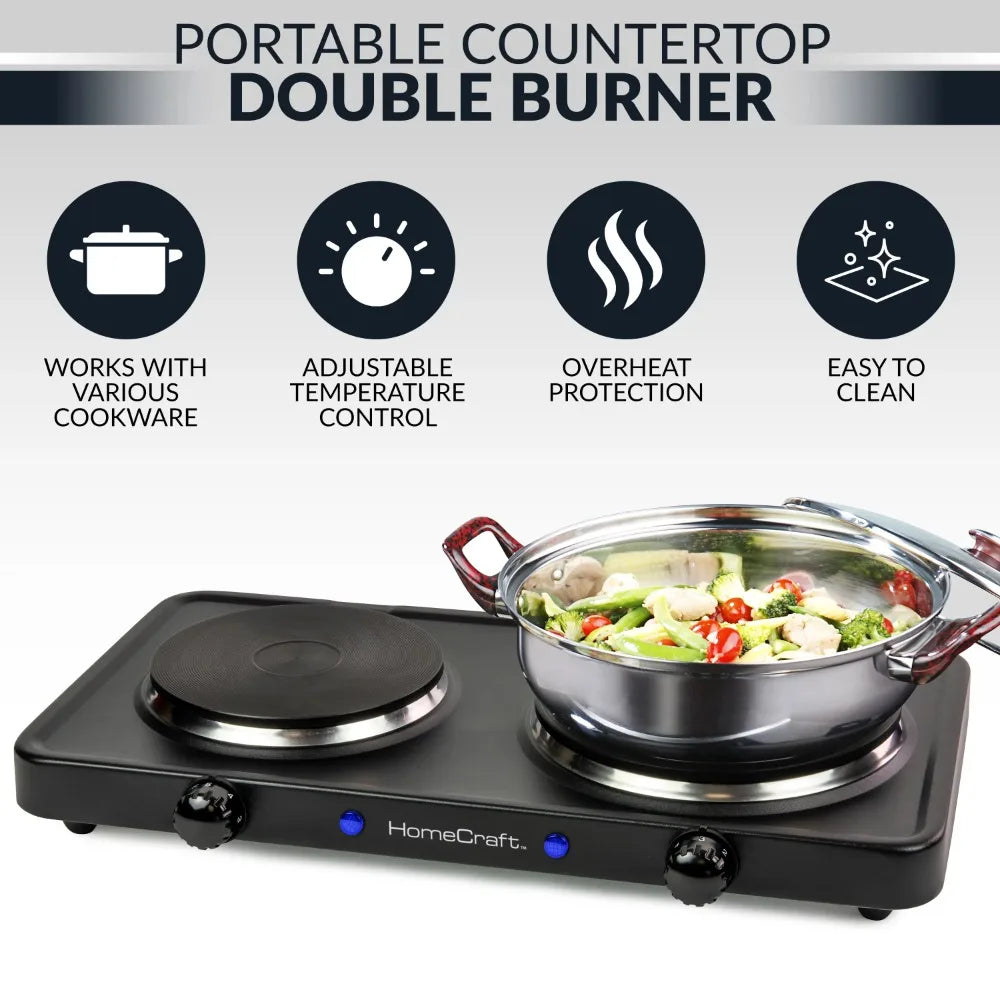 - PORTABILITY: Compact and convenient, the double burner hot plate is a great addition to any back-to-school dorms, small kitchens and is great for travel and on-the-go in campers or RVs