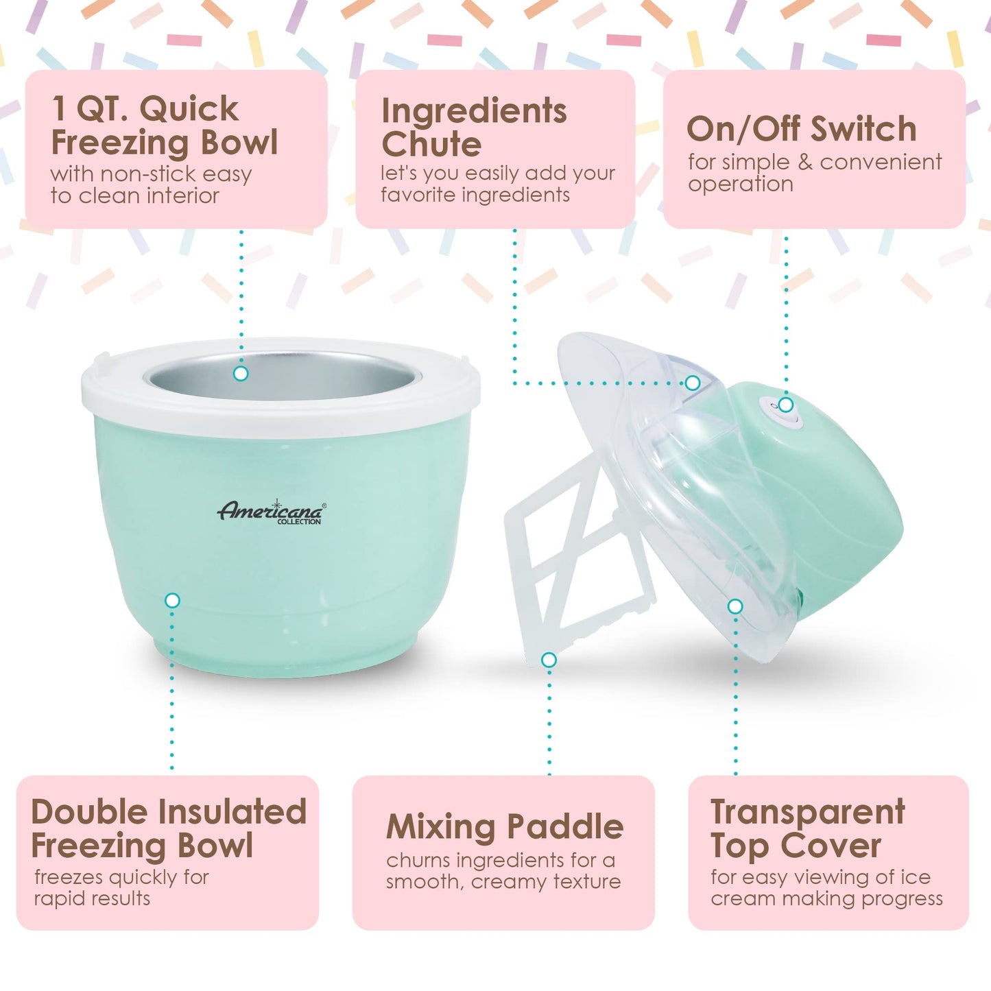Details: The Americana 1Qt. Electric ice cream maker churns out delicious homemade ice cream in less than 40 minutes. It features a 1-Quart quick freeze bowl and a powerful motorized paddle, so making ice cream is fast, convenient and fun for the whole family! It's great for entertaining at family parties, BBQ and picnics using all of your favorite ice cream, sorbet, gelato and even frozen yogurt recipes. The motor turns the paddle that whips air into the ingredients producing a smooth, rich soft serve ice cream. The paddle quickly crushes cookies, fruit, chocolate chips or a variety of other yummy toppings and thoroughly integrates them into the mixture. All parts conveniently remove for easy cleaning.