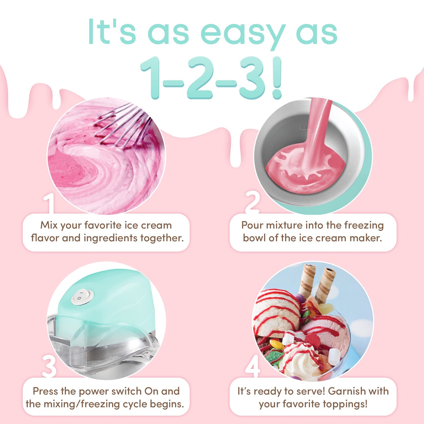 - QUICK & EASY TO USE: The ice cream and dessert maker is simple to use. Simply freeze the bowl overnight, then add the ingredient mixture into the machine, push a button and you'll have a tasty dessert in a short time.
