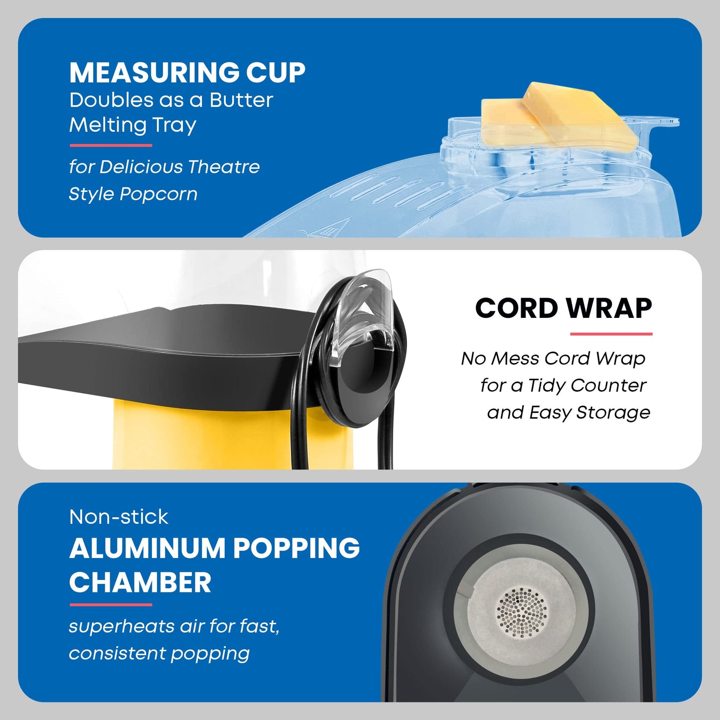 - MEASURE & MELT: Includes a measuring cup that doubles as a butter melting tray. Melt butter while popping so you can enjoy hot fresh buttery popcorn theatre style at home.