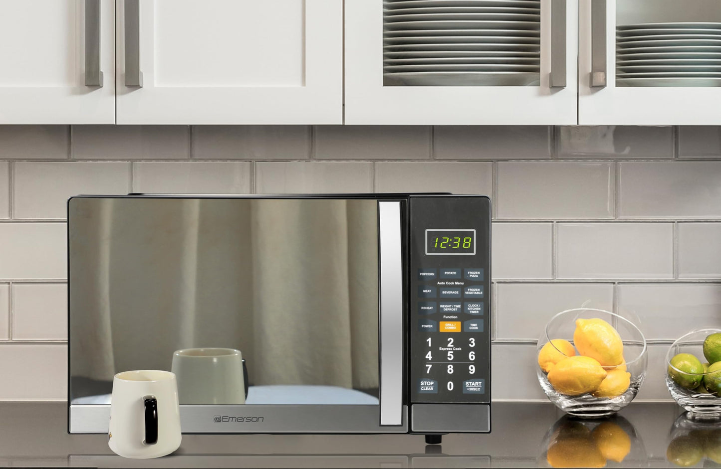 Emerson MWG1191SB Countertop Microwave Oven with 1100W Grill Function, Sleek Mirrored Finish 10 Power Levels, 6 Auto Menus, Glass Turntable and Child Safe Lock, 1.1 Cu. Ft, Stainless Steel