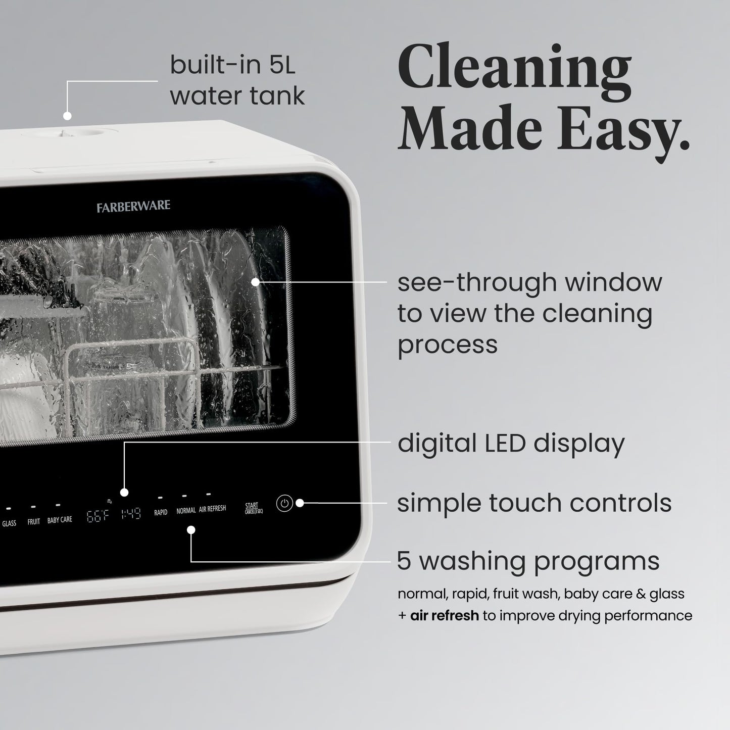 - VERSATILE CLEANING: The Farberware countertop dishwasher offers five different wash cycles, including baby care, glass, and fruit wash, ensuring that all your dishes, from delicate glassware to baby bottles, are thoroughly cleaned and sanitized.