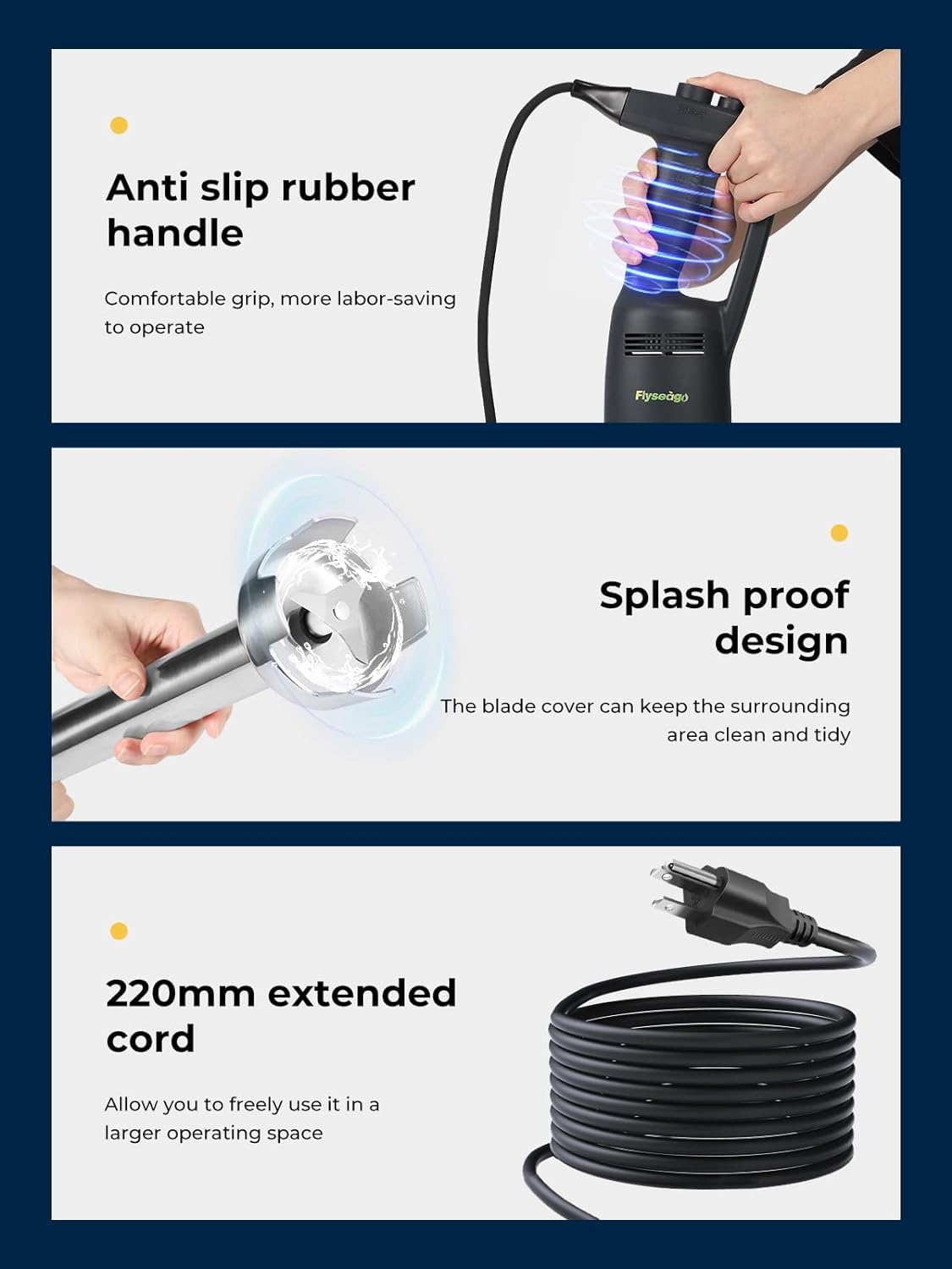 - Thoughtful Design: Ergonomic design of the machine body creates more comfortable to use. Anti slip rubber handle, easier to grip, more labor-saving to operate, and reduces fatigue during the working process. The whole machine is well-made, sturdy and durable, and the splash-proof design of the blade cover can keep the surrounding area clean and tidy. 220mm extended cord allows you to use it freely in a larger operating space