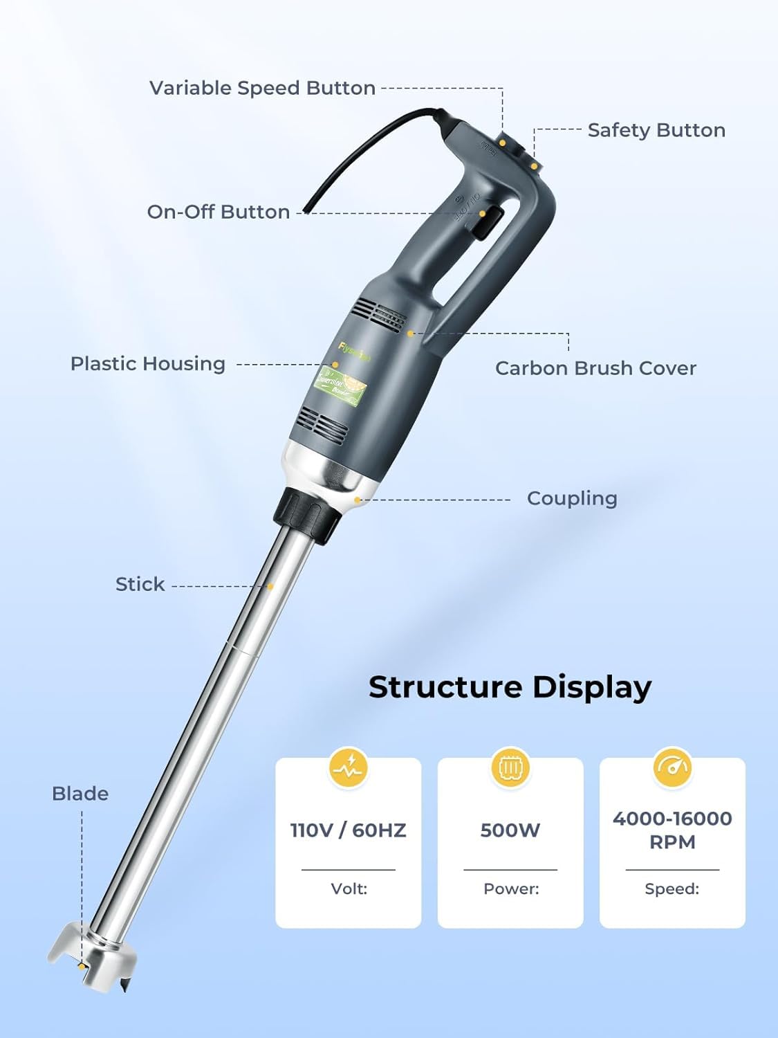 - Powerful: This commercial immersion mixer is equipped with a 500W ultra powerful pure copper motor, which has a longer service life. Capable of stepless speed regulation, 4000-16000RPM, fast mixing and emulsifying. Heavy-duty structure, smoother operation, and lower noise generated during use