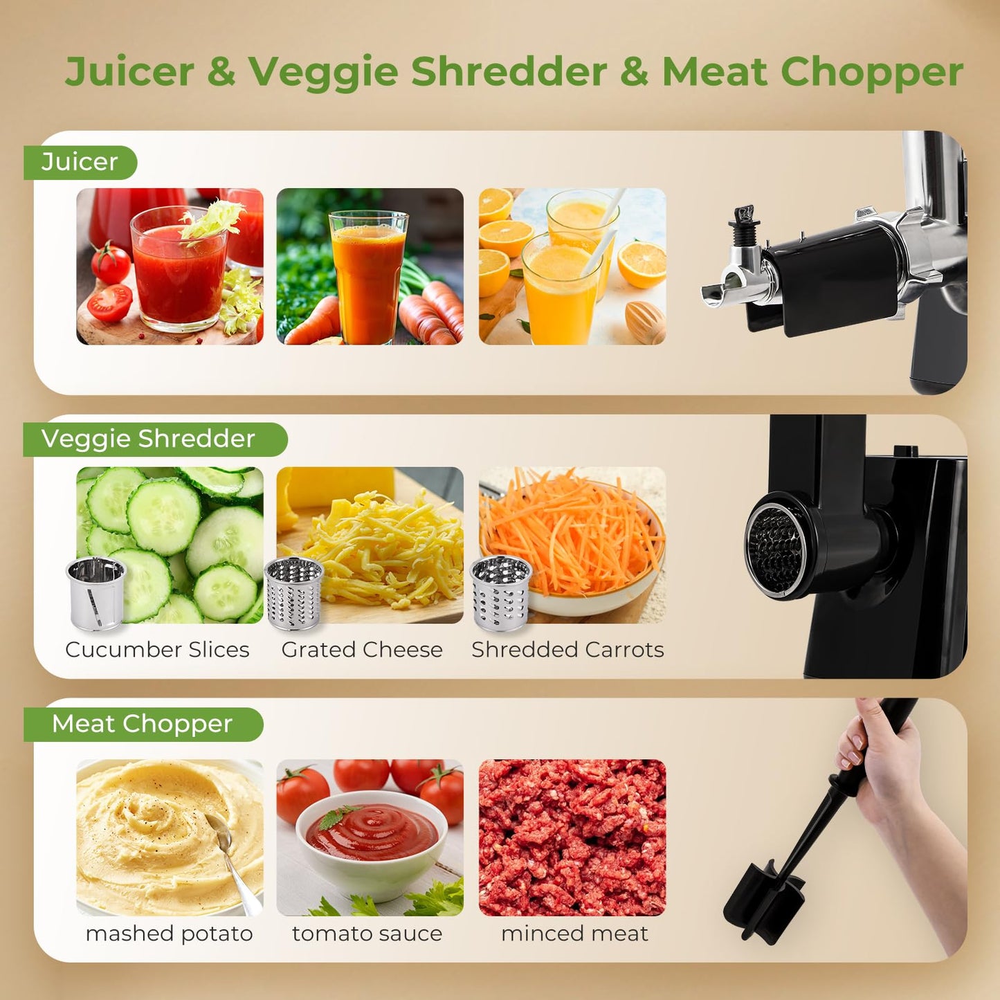 - Multifunctional Meat Grinder: Our meat grinder is equipped with multifunctional accessories: 2 stainless steel blades, 3 grinding plates (3/5/7mm), 2 sausage stuffers, 1 juicer, 1 kubbe kit, 1 vegetable slicer/shredder/grater, 1 food pusher and 1 meat chopper