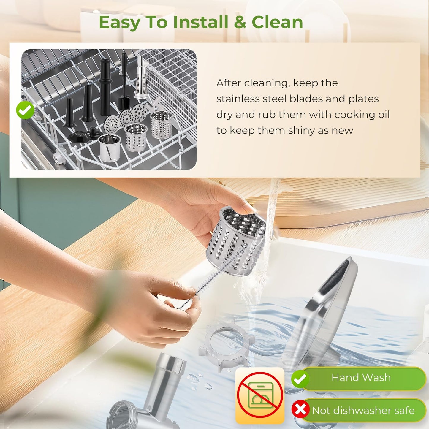 - Easy to Install & Clean: All the parts of the electric meat grinder are removable and easy to clean. When the meat grinder is overheated, the automatic built-in circuit breaker will start to work and protect the machine so to prolong the service life