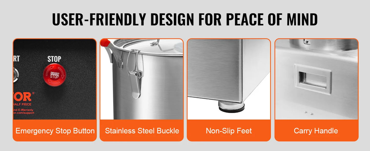 Our stainless steel locking mechanism securely holds your ingredients in place, ensuring your security. This food processor adopts four robust suction cup feet, providing enhanced stability while avoiding any unwanted slips. Your peace of mind is our top priority.