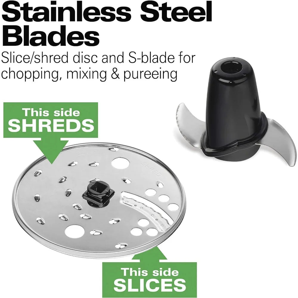 VersatilityReversible disc slices and shreds, while the stainless steel s-blade chops, mixes and purees. |
