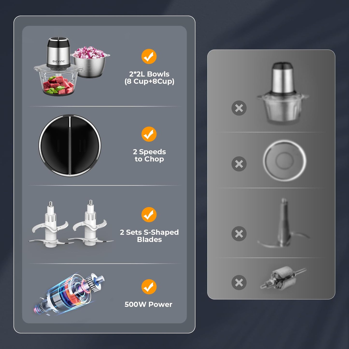 - 【2 Set 8 Cups Bowls with 2 Set Stainless Steel Blades】A 2l stainless steel bowl and a 2l glass bowl can handle different ingredients separately to avoid stringing of flavors. Equipped with 2 s-shaped blades for more efficient handling of ingredients.