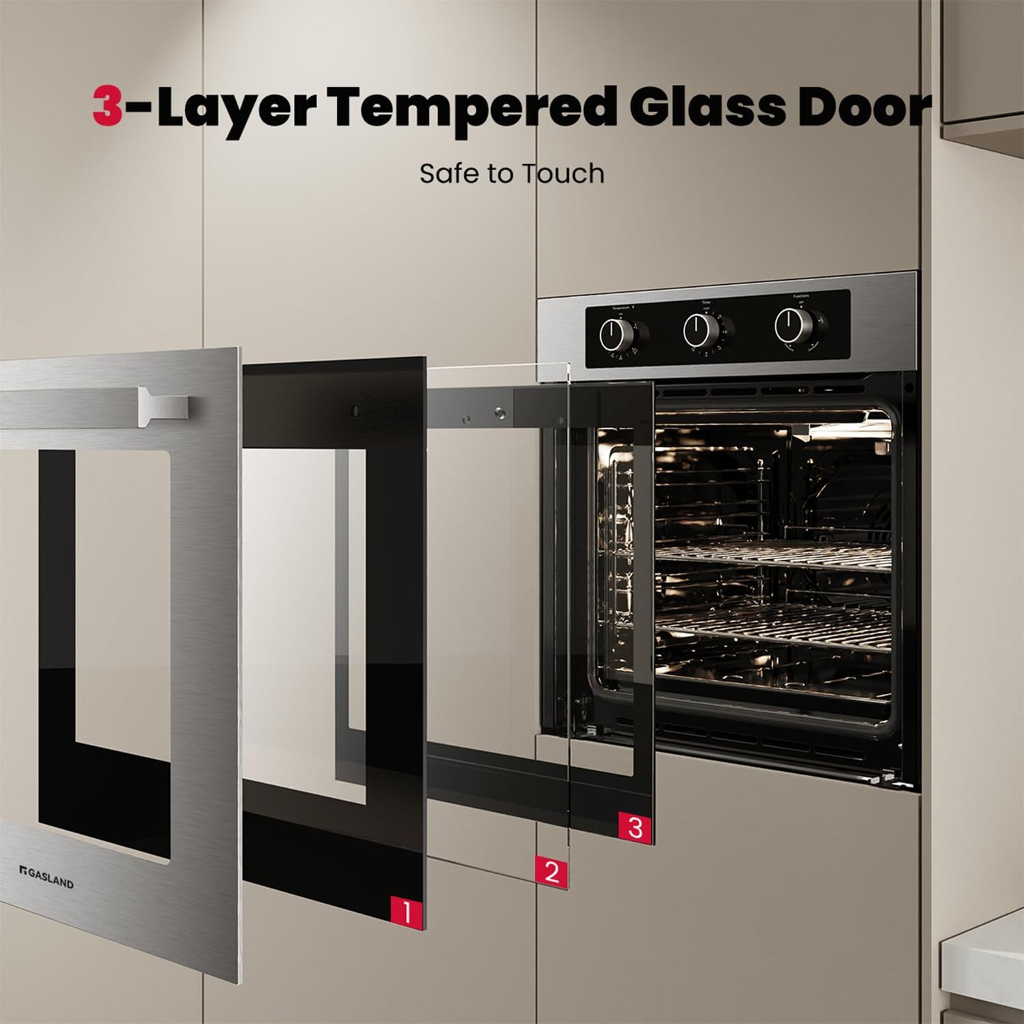 - 【3-Layer Tempered Glass Door】 The oven door is made of upgraded 3-layer tempered glass, and the handle is made of aluminum alloy. This design can effectively insulate high temperature to ensure safety. The door is removable for easily maintenance.