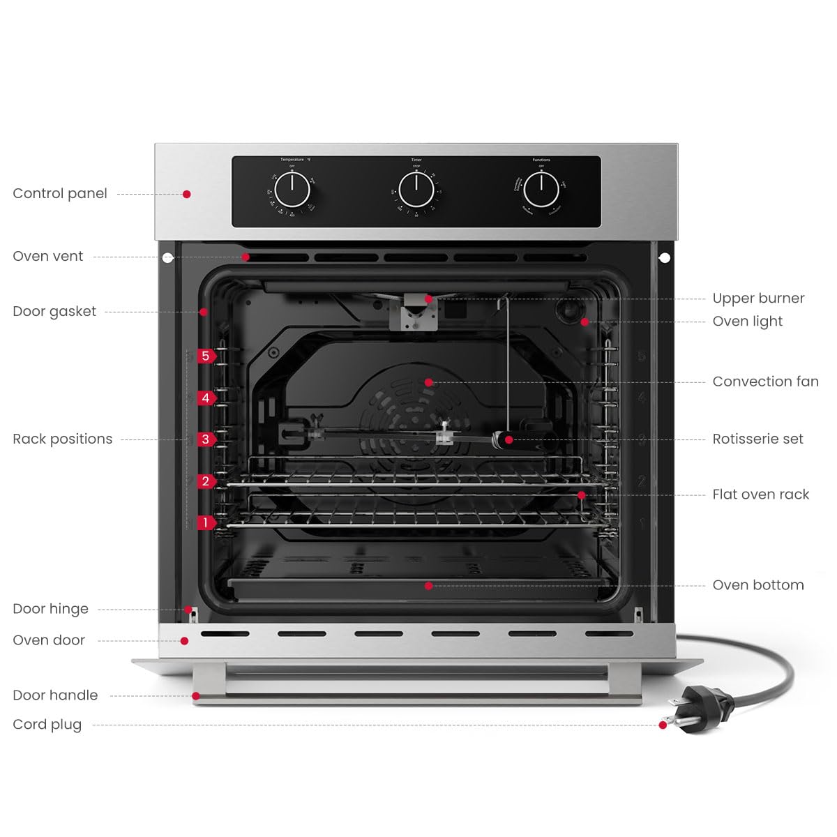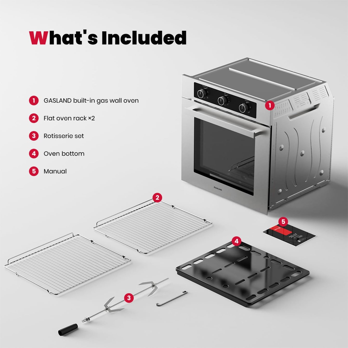 - 【5 Shelf with 2.12 cu.ft Large Capacity】This 24 inches single wall gas oven has a 5-layer shelf to place baking trays and racks. Cames with US Standard 120v cord plug (Electric Ignitor), rotisserie set (according to cooking function) and two flat oven racks in the package.
