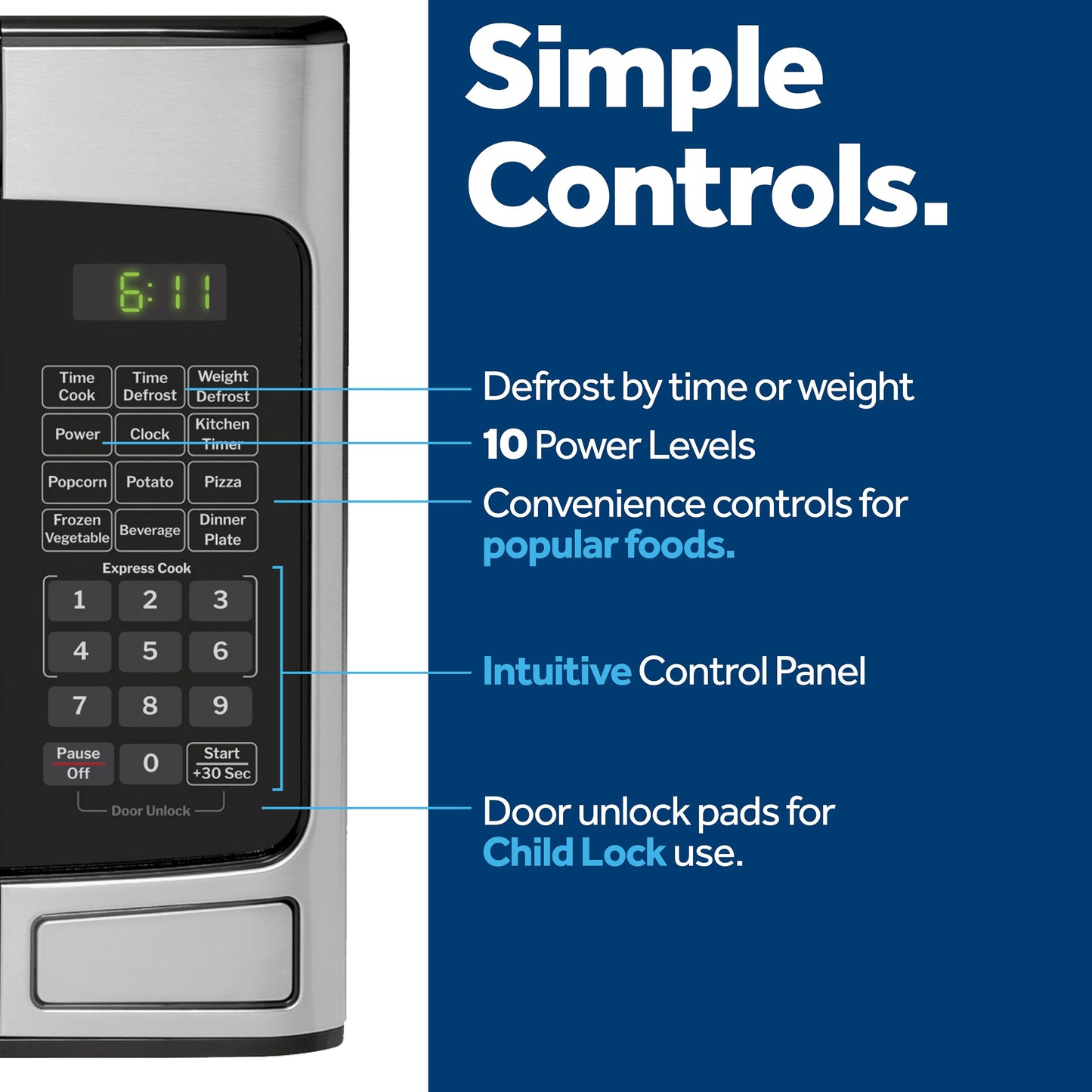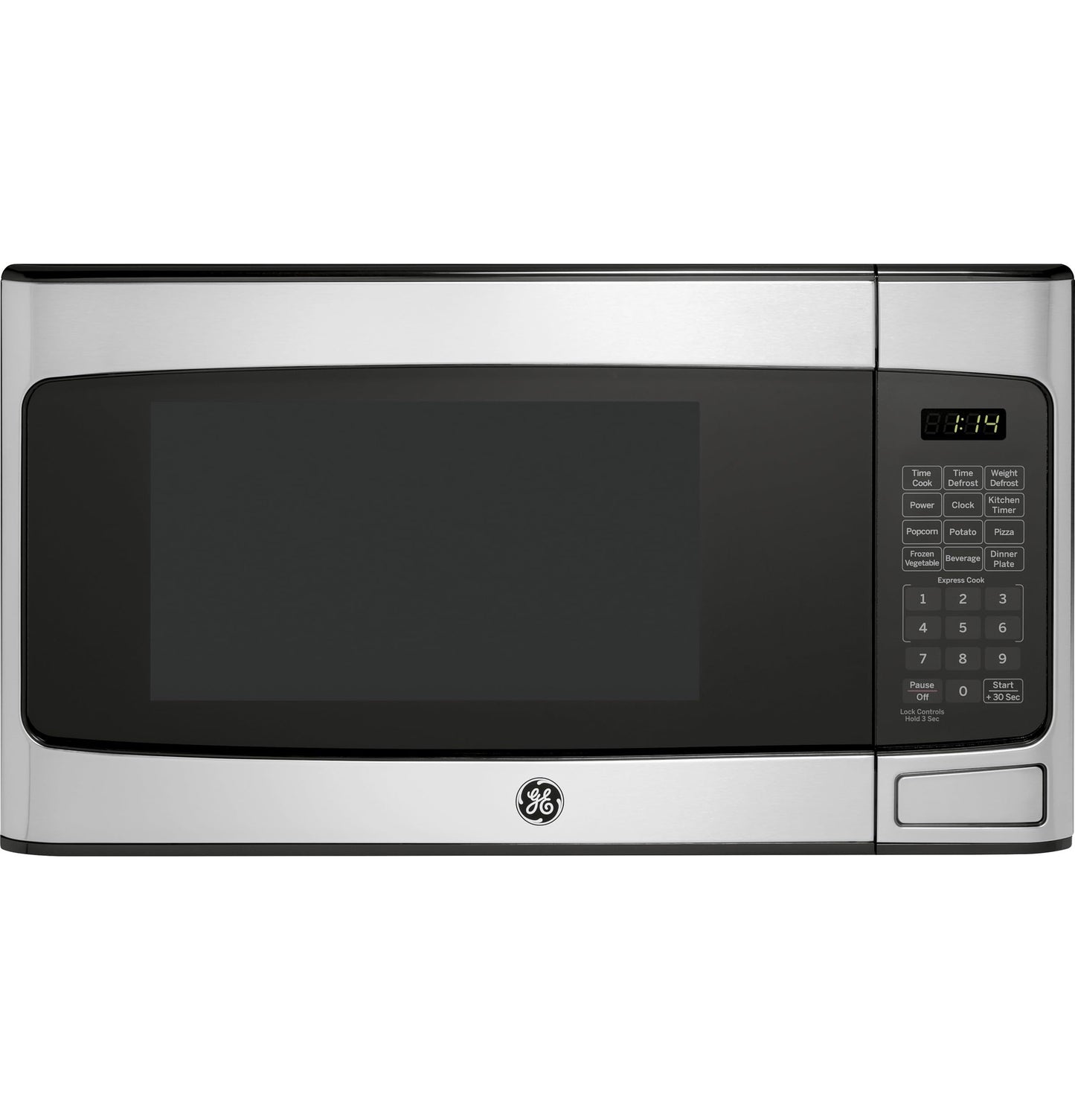 GE Countertop Microwave Oven, Compact 1.1 Cubic Ft., 950-watt Capacity, 6 Auto Cooking Settings, Child-Lock Technology, Kitchen Essentials for the Countertop, Dorm Room or Apartment, Stainless Steel