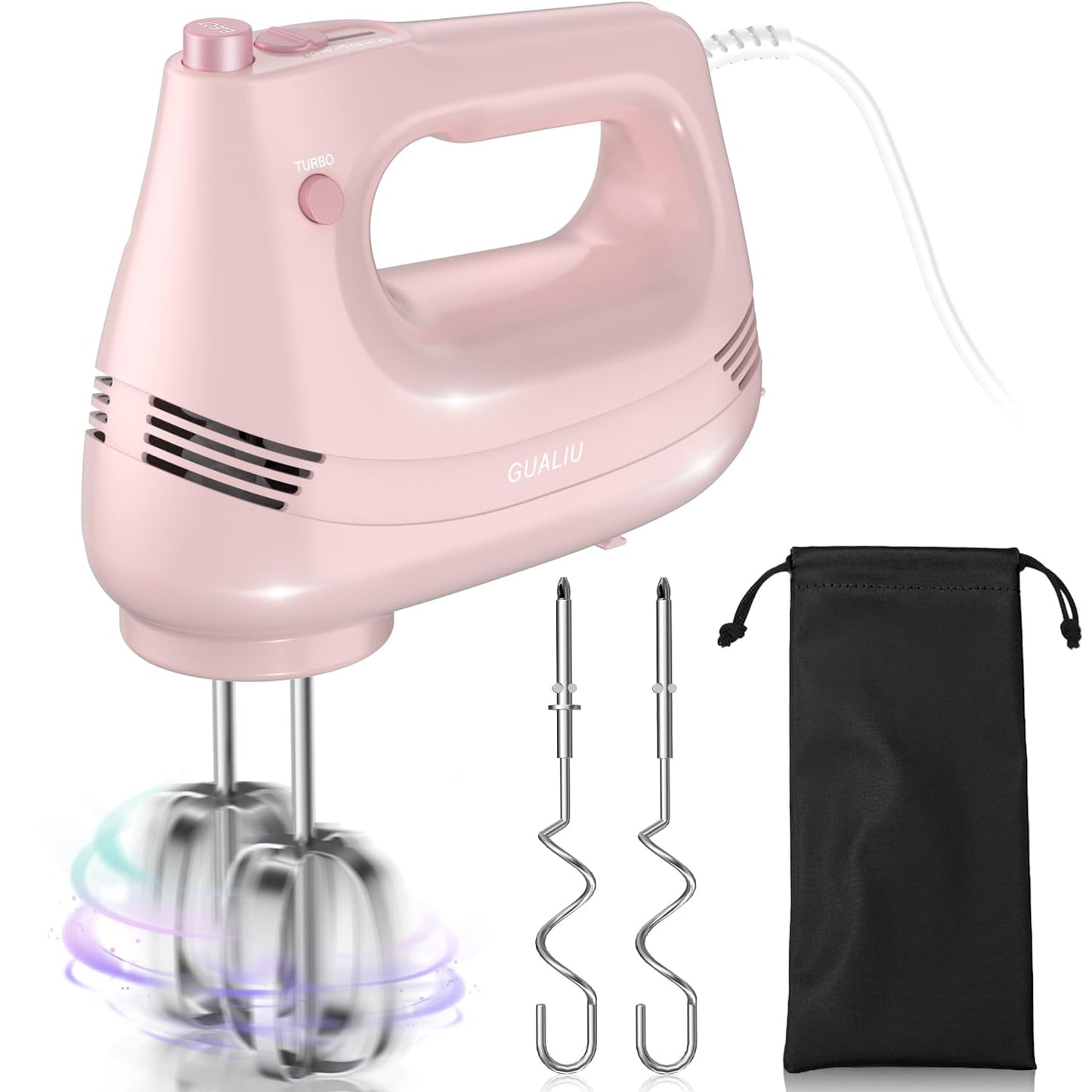 GUALIU Electric Hand Mixer with Stainless Steel Whisk, Dough Hook Attachment and Storage Bag, Handheld Mixer for Baking Cakes, Eggs, Cream Food Mixers. Turbo Boost /5 Speed Kitchen Blender PINK
