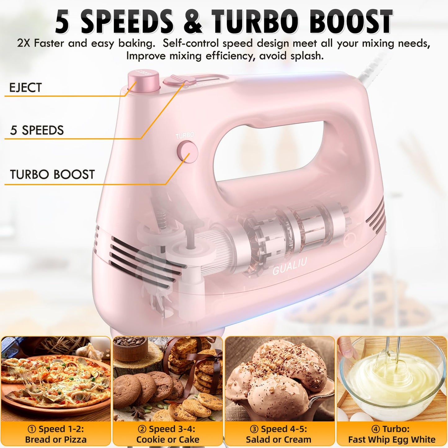 - ๐งใ๐๐ฎ๐ซ๐๐จ ๐๐จ๐จ๐ฌ๐ญ & ๐๐๐ฅ๐-๐๐จ๐ง๐ญ๐ซ๐จ๐ฅ ๐๐ฉ๐๐๐ใ: GUALIU hand mixer features a 5-speed self-controlled speed and an additional turbocharging feature that allows you to choose the best mixing speed for any recipe. Suitable for whipped cream, butter, egg whites and batter, as well as mashed potatoes and other dishes!