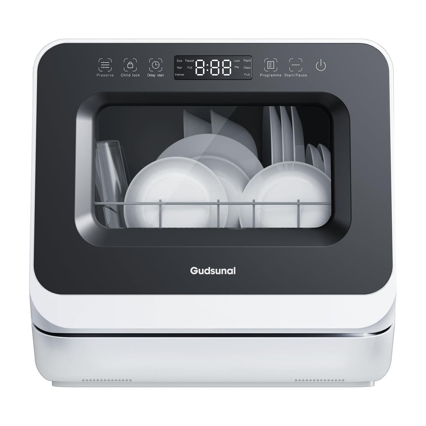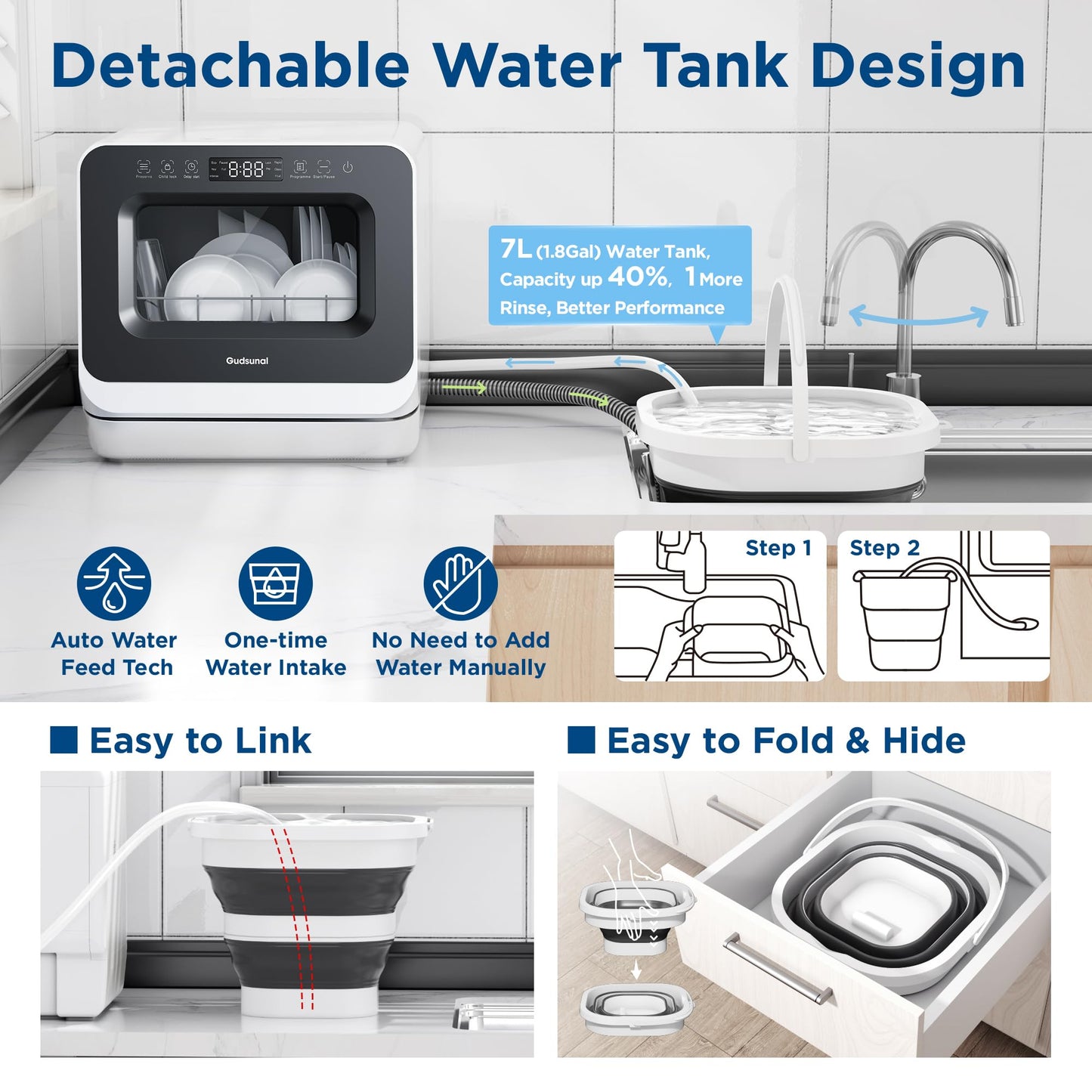 Gudsunal Portable Countertop Dishwasher, 7L Detachable Water Tank, 6 Programs,No Hookup Needed, 192℉ Hi-Temp Hygiene, Hybrid Drying & Preserve Fuction, Mini/Small Dishwasher for RV & Apartment,Black