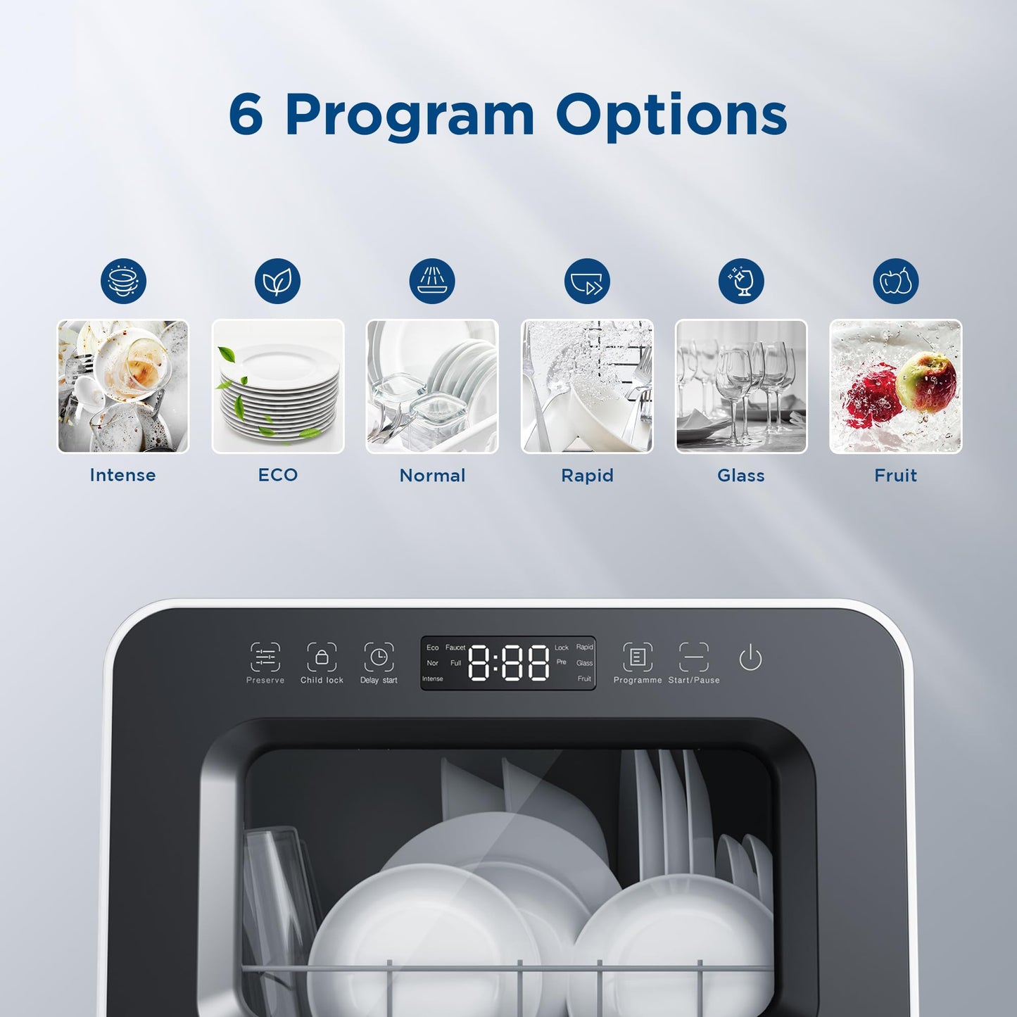 • 6 Program Options: This portable countertop dishwasher offers 6 programs (Intense, Eco, Normal, Rapid, Glass, Fruit) to cater to various washing needs, providing flexibility and thorough cleaning for different types of dishes