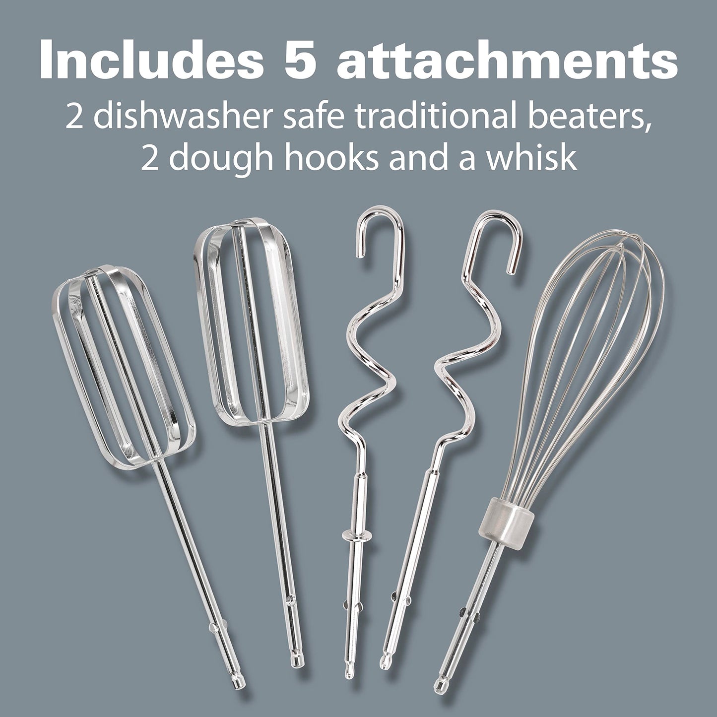 - VERSATILE ATTACHMENTS: Hand mixer comes with 5 easy-to-clean attachments—traditional beaters, dough hooks and a whisk—so you can get mixing right away.