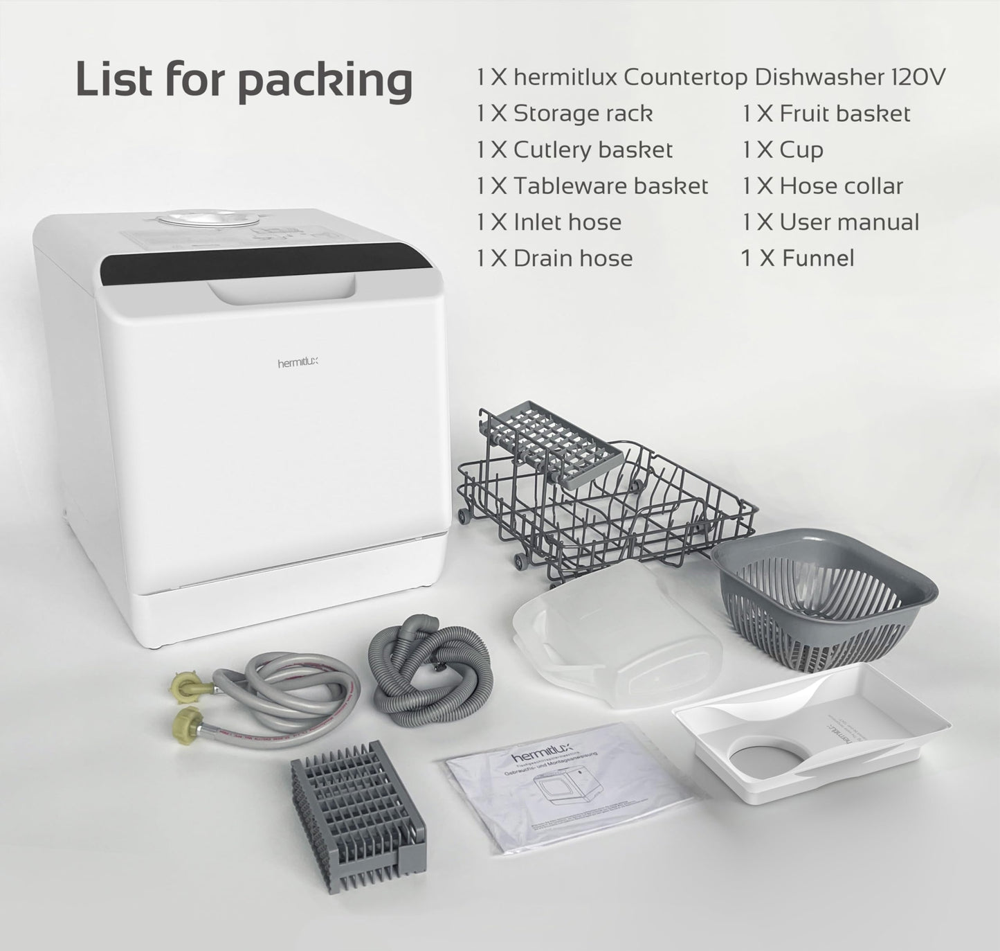 Hermitlux Countertop Dishwasher, 5 Washing Programs Portable Dishwasher With 5-Liter Built-in Water Tank, No Hookup Needed