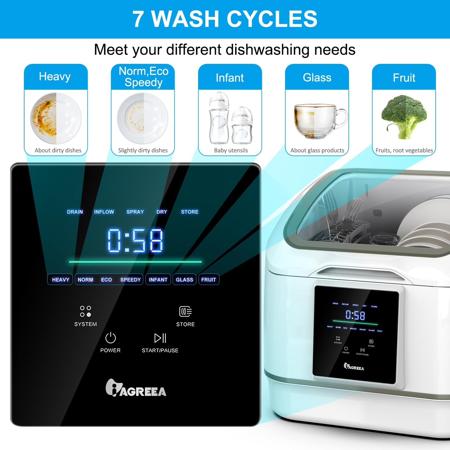 - 7 Wash Cycle Options: IAGREEA portable countertop dishwasher supports HEAVY, NORM, ECO, SPEEDY, INFANT, GLASS, and FRUIT modes for your various dishwashing needs. An extra STORE mode offers 72-hour ventilated storage to prevent odors and keep your dishes clean. In order to save energy, it is not turned on automatically. Please turn on the STORE mode by yourself when you need it.