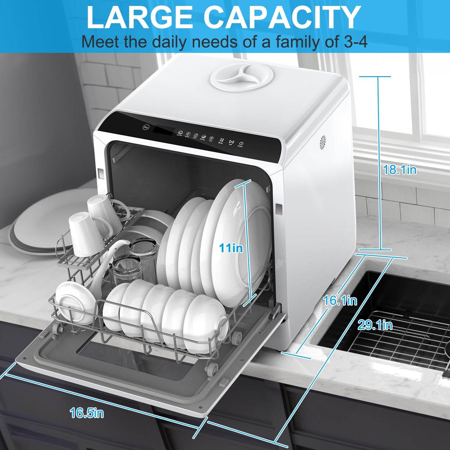 - Compact & Large Capacity: The size of the compact dishwasher is 16.7"D x 16.9"W x 18"H Inches. You can put it on any table or shelf. After putting in the dishes of a family of three, you can enjoy parent-child time more. It is a tabletop dishwasher, dryer, and cabinet.