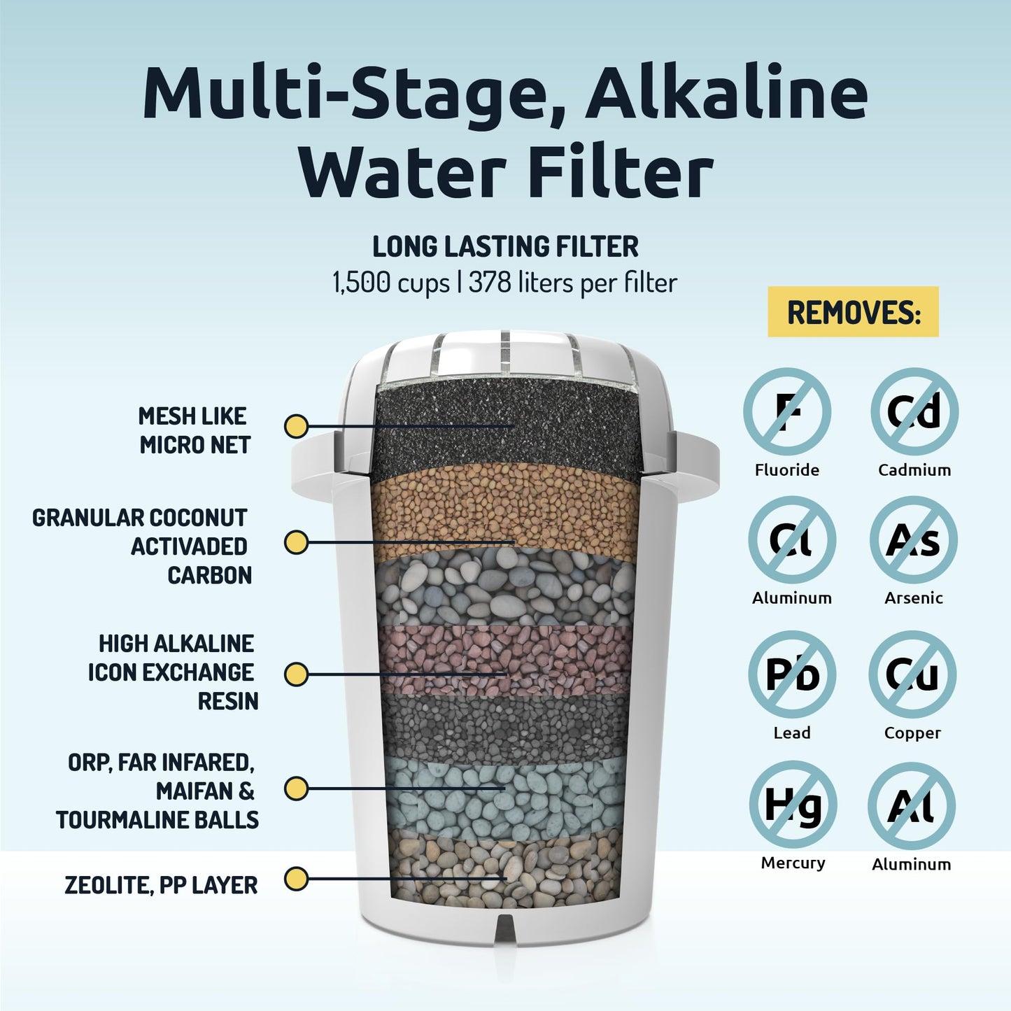 - HIGH PH ALKALINE WATER DISPENSER: Our Alkaline Water Machine for home is equipped with 3 pH001 filters. Each alkaline water filter increases pH up to pH9 and removes unwanted particles and heavy metals while keeping minerals like calcium and magnesium.