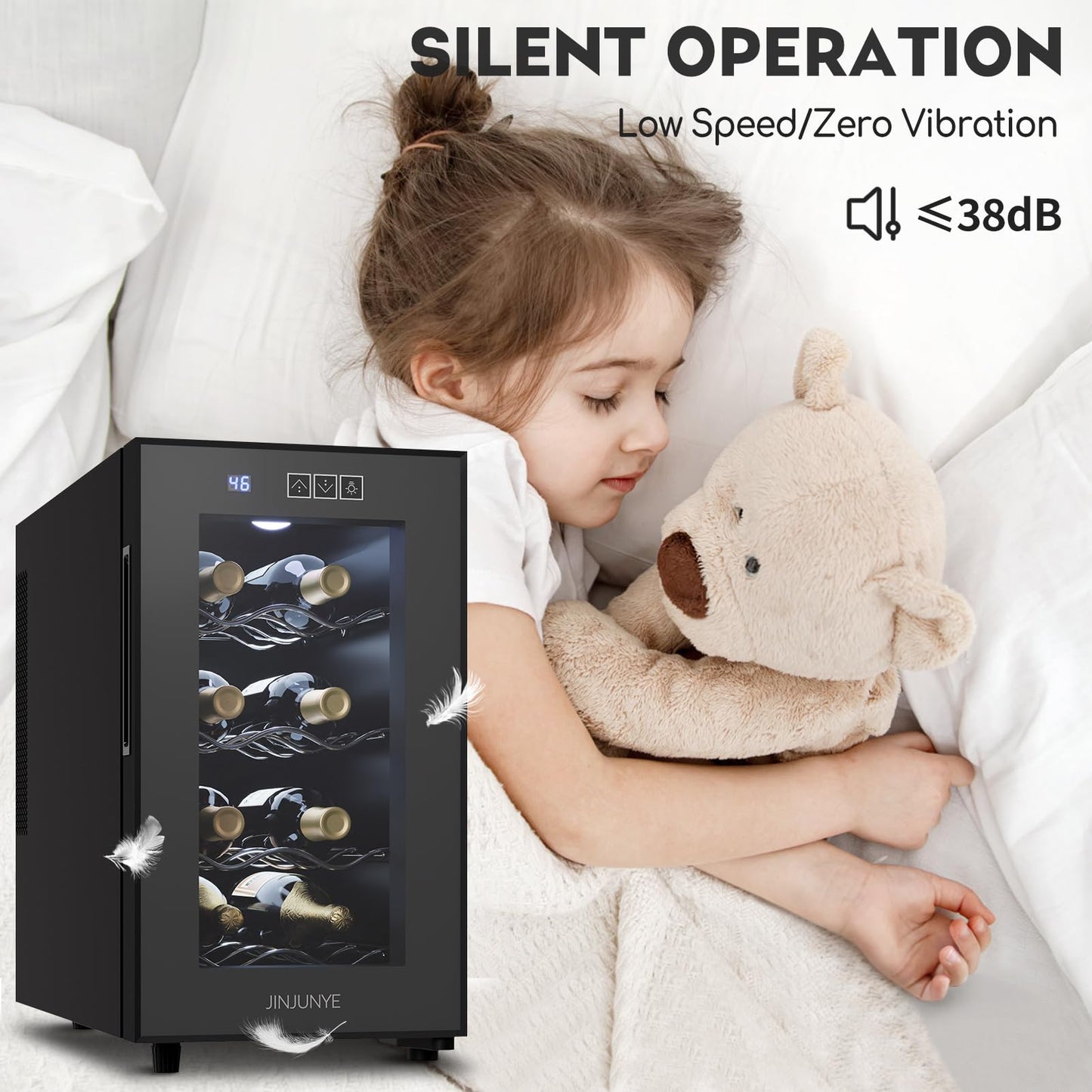 - ๐๐๐๐๐ & ๐๐๐๐๐ฝ๐๐ผ๐๐๐๐ Countertop wine fridge utilizes an advanced thermoelectric cooling system, energy efficient & minimizes vibration and noise, especially for aged wines, JINJUNYE wine cooler can prevent the sediment inside the bottles from being stirred up, protecting the quality and taste of the wines.