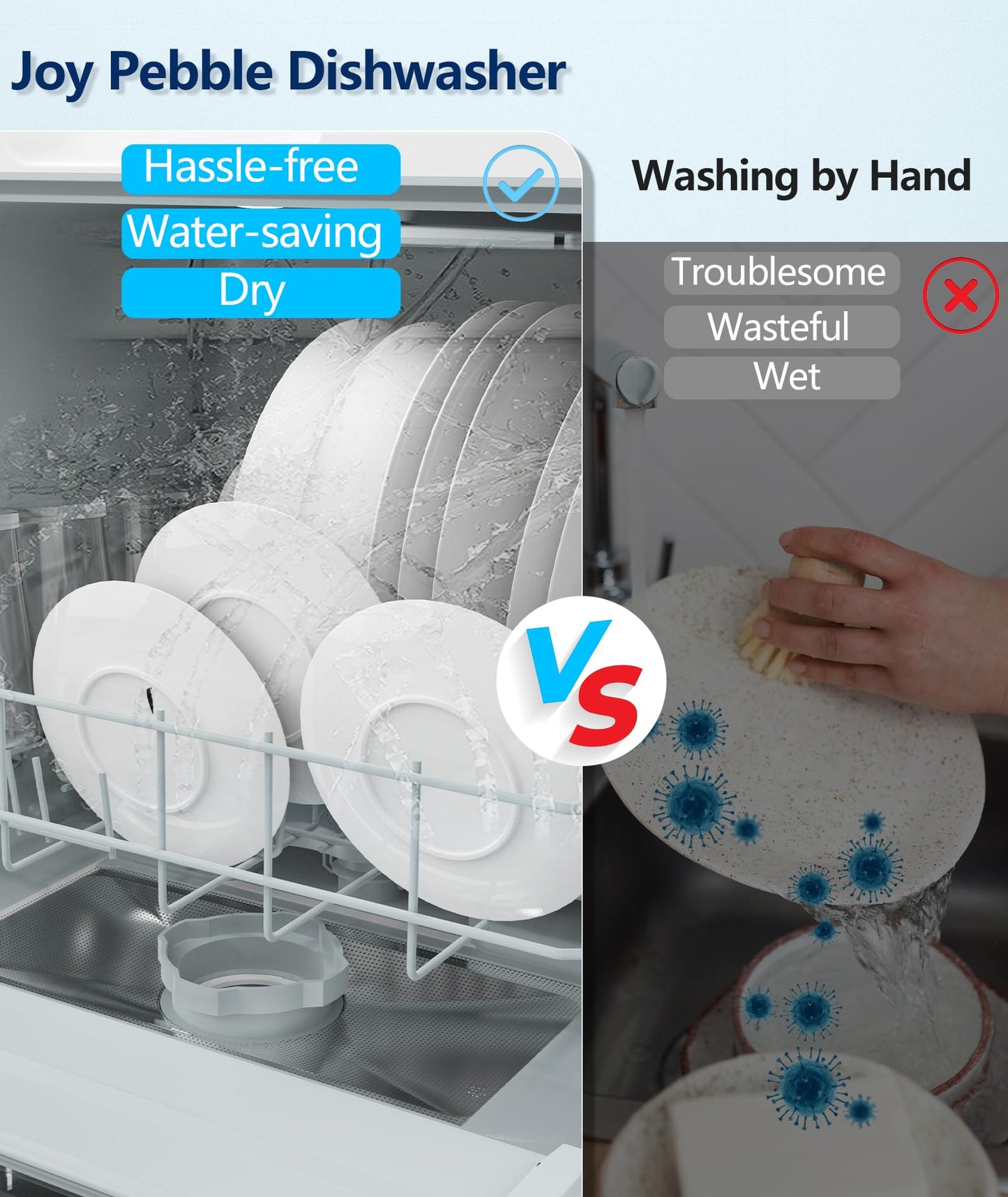 - 【360°Dual Spray Arm &Note】: Joy Pebble dishwasher's upper and lower dual spray arms, you can fully clean stains in 360 degrees, so you can free your hands and enjoy your life.Note: Please use a standard dishwasher cleaning powder, regular liquid dish soap can cause the dishwasher to malfunction.