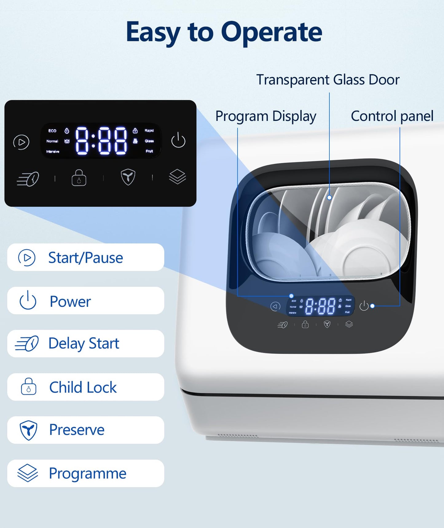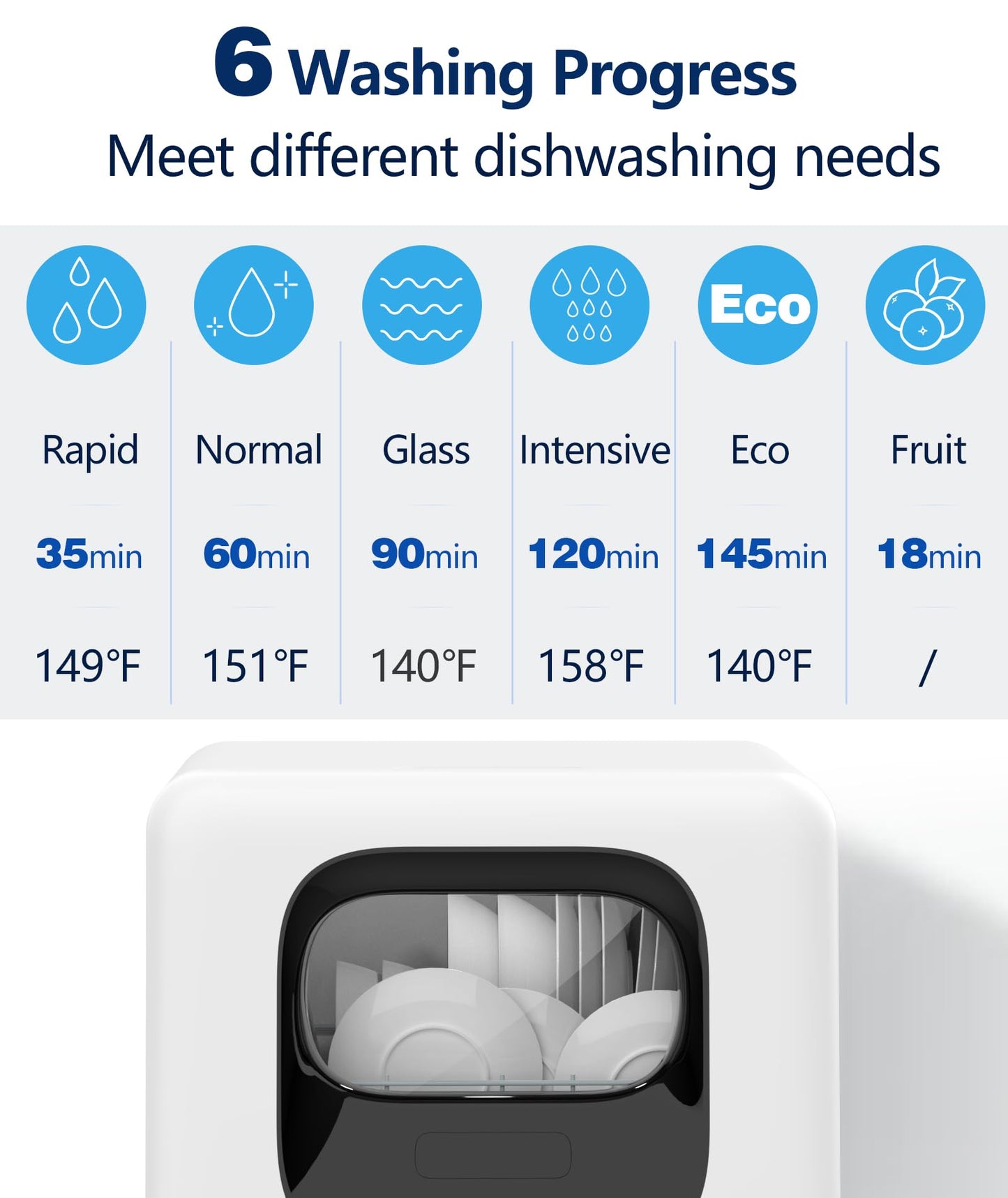 - 【6 Washing Programs &Smart Touch Screen】:With up to 6 wash programs, Joy Pebble countertop dishwasher allows you to choose the right wash program according to cleaning needs. The water temperature can reach up to 158 °F during the washing process, baby items can be washed without worry. In addition the small dishwasher also features an LED touch screen for clear, easy-to-understand operation.