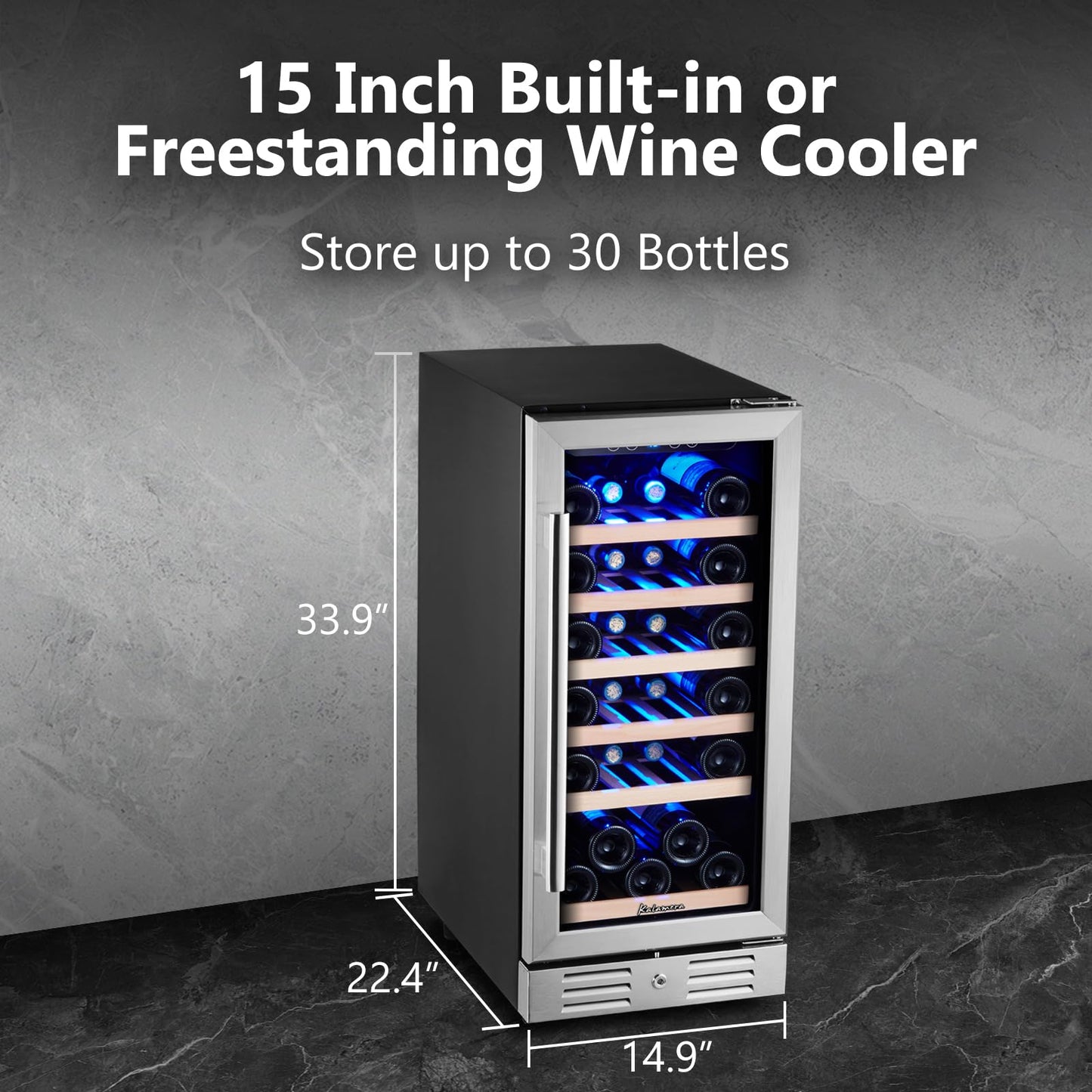 - ★SMALL COOLER WITH GREAT STORAGE: This mini wine fridge holds up to 30 bottles of your favorite wine in different sizes, and is only affected when having a larger bottle, like Pinot or Champagne. It's the perfect choice for the wine lover having various wine collections. Soft blue LED lights keep your wine in a beautiful environment, help you select your favorite wine at all times.