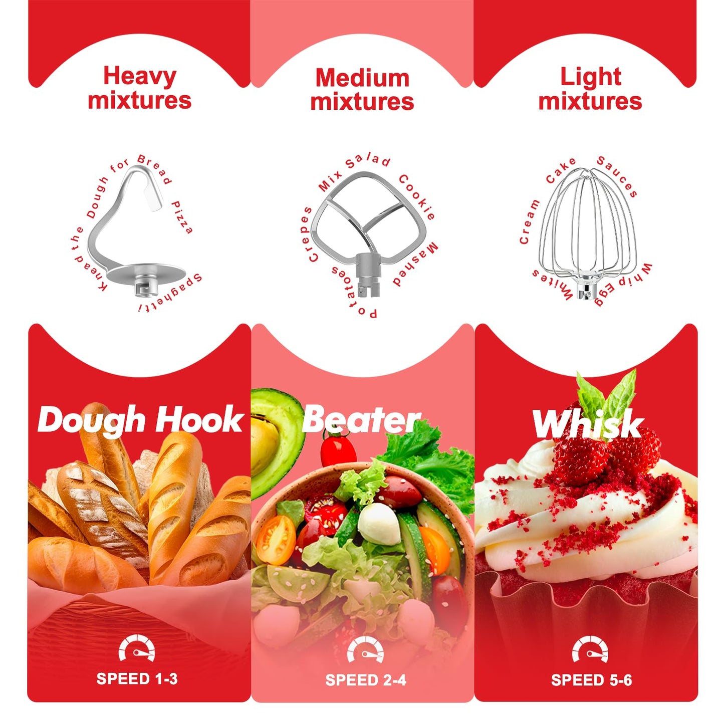 - 6.5QT Mixing Bowl with Handle: Our stand mixer has a 6.5QT stainless steel mixing bowl, which is ideal for mixing and cooking a variety of ingredients, sufficient capacity to make various types of bread; cookies; pizza; cream cakes and mix salads