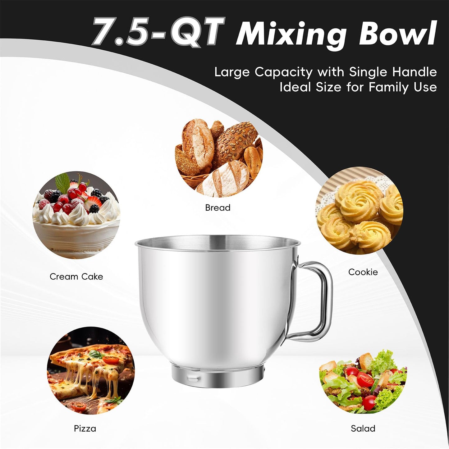 - 7.5QT Mixing Bowl with Handle: This kitchen electric mixer with a single-handled stainless steel bowl makes it easy to handle and mix various ingredients, suitable for family gatherings and parties, and produces delicious dishes that will delight your family and friends