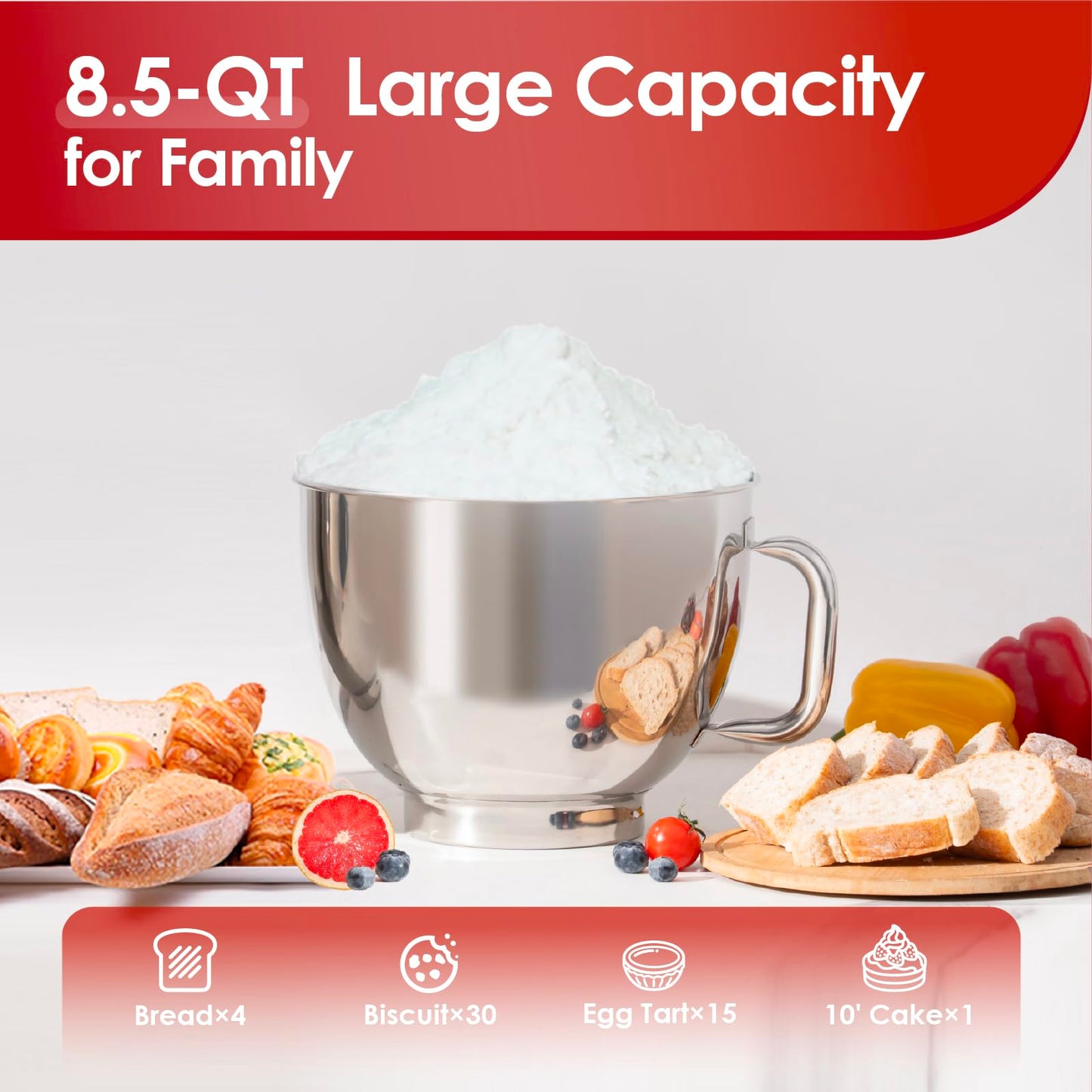 - 8.5 QT High Capacity: Our stand mixer comes with an 8.5 QT stainless steel bowl, providing ample space for preparing large batches of dough, batter, or mixtures. It's ideal for family meals, gatherings, and large-scale baking projects. The convenient single-handle design allows for easy lifting and pouring with hands.