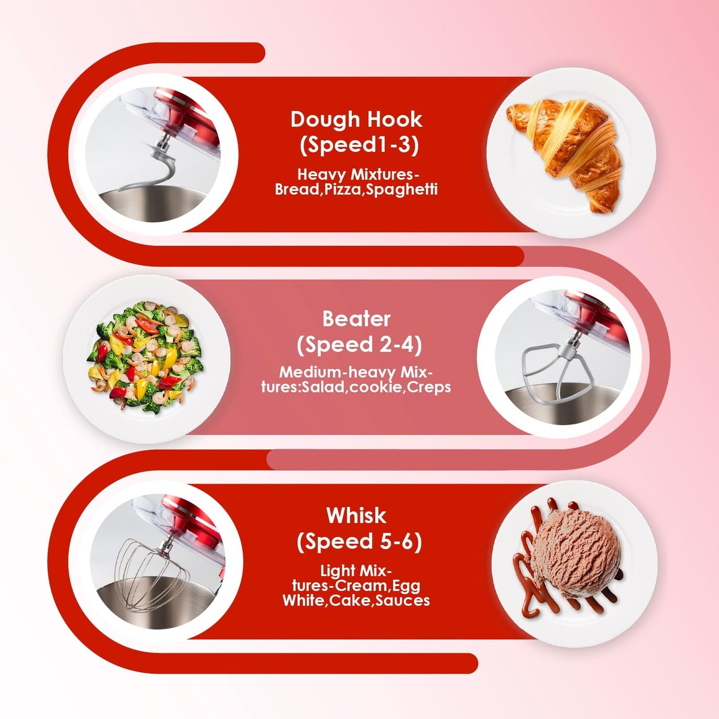- 6 Speed, Easy to Use: This kitchen mixer features six adjustable speed settings and easy operation to meet your diverse mixing needs. The tilt-head feature allows for effortless switching between bowls and attachments.Its intuitive design ensures ease of use, making it ideal for both beginners and experienced bakers, delivering reliable performance for baking tasks.